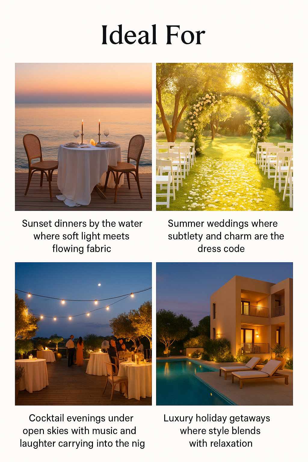 It’s in the quiet elegance of settings like these that style feels most alive. Light shifting across water, the warmth of an evening sky, the laughter that carries into the night—each moment becomes part of the look itself. Fashion here isn’t separate from the scene; it blends into the atmosphere, enhancing it with subtle confidence. This is where clothing becomes more than fabric, where it transforms into memory, mood, and presence all at once.