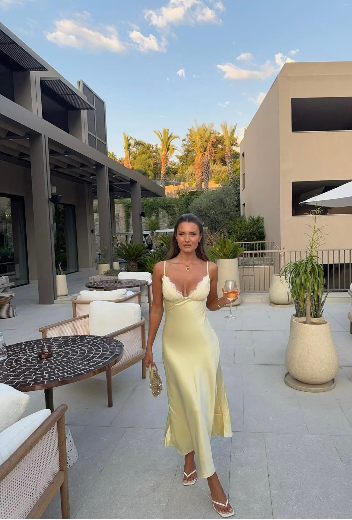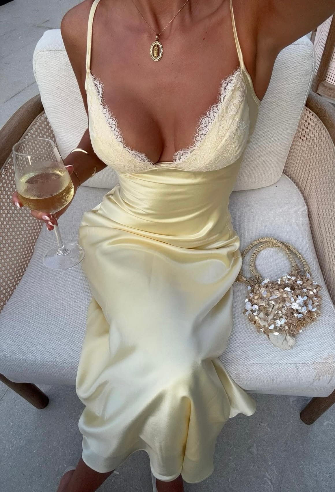 The soft yellow satin dress moves with a liquid shine, catching light in every fold and curve, transforming a simple silhouette into something magnetic. Its delicate lace trim adds just enough softness to balance the sleekness of the fabric, creating a dialogue between femininity and modern polish. Nothing feels forced about this look—it’s the kind of dress that works because it aligns perfectly with the moment: warm evenings, cool glasses of wine, and settings that allow beauty to unfold naturally.