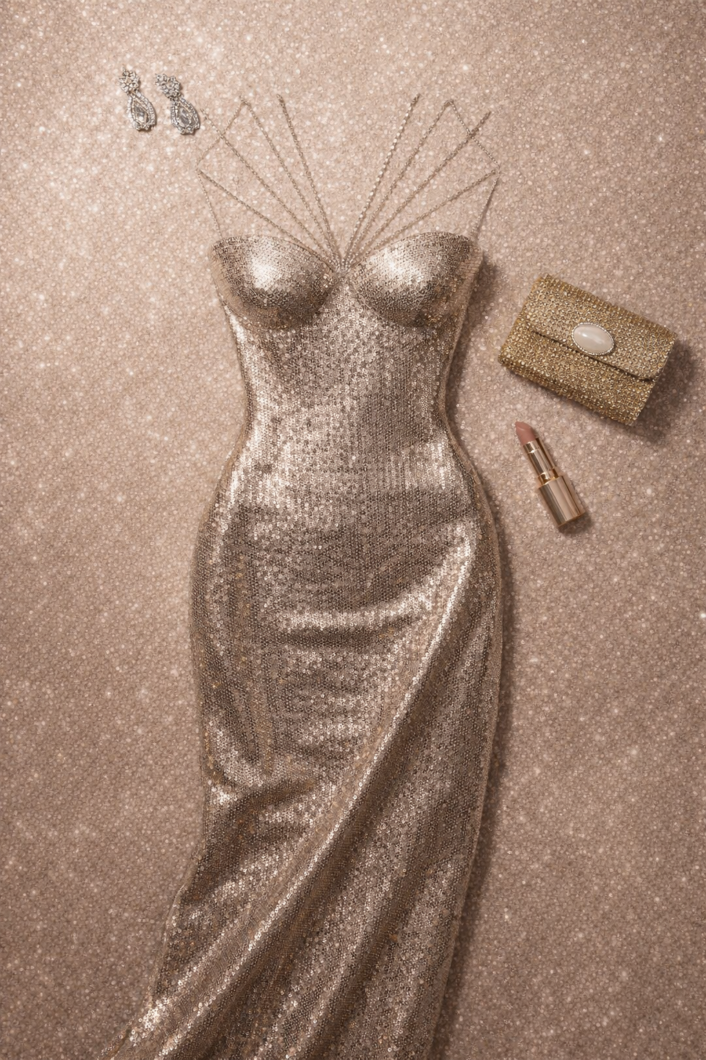 "Luxury fashion flatlay of a champagne gold metallic sequin evening gown with sculpted corset bodice and crystal chain neckline detailing, laid neatly on a soft shimmering champagne fabric background. Include matching gold rhinestone clutch placed to the side, delicate diamond drop earrings positioned above the bodice area, and nude-toned lipstick placed diagonally for balance."