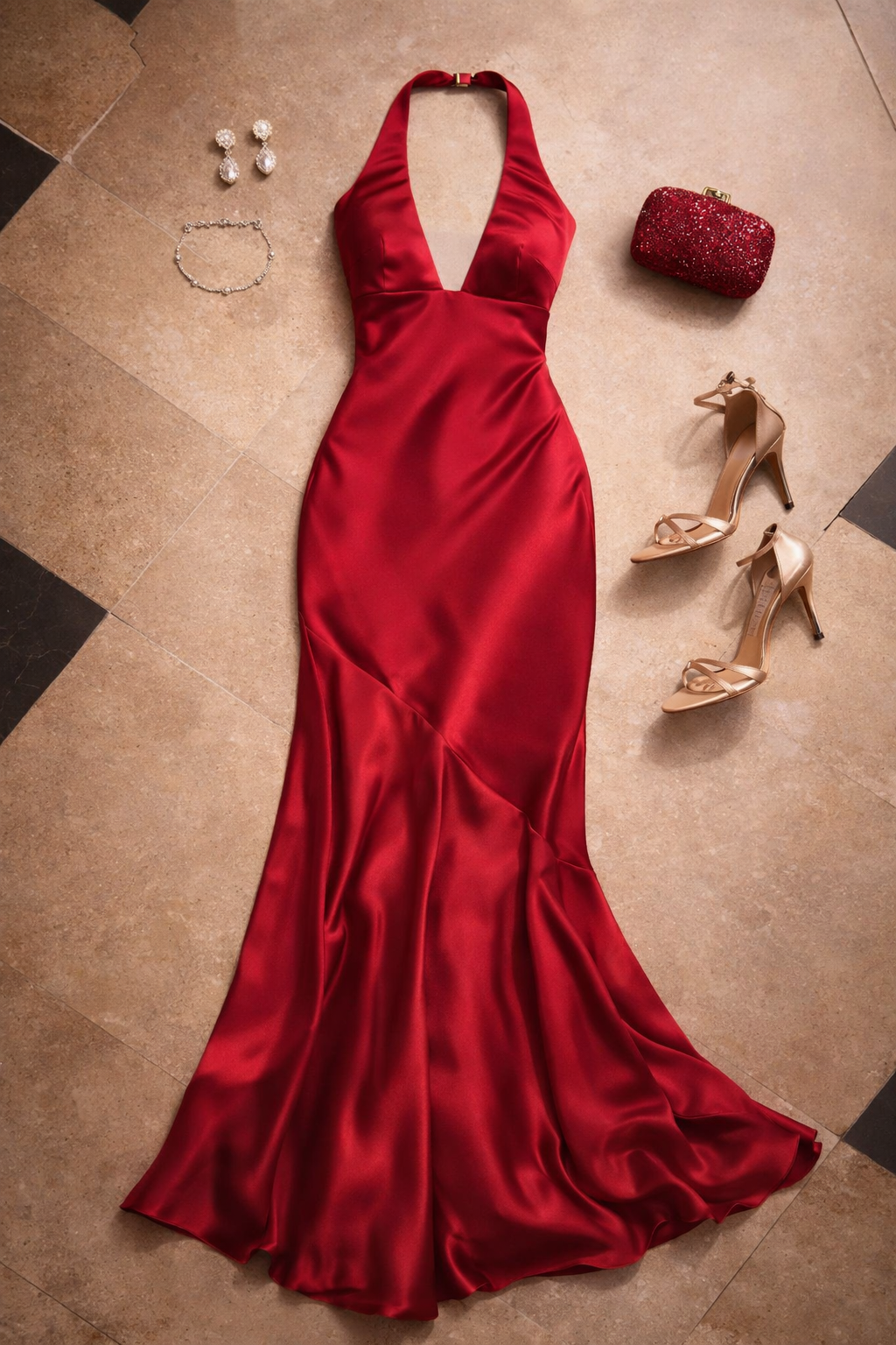 "An editorial fashion flatlay photographed from directly overhead on a warm stone or marble surface inspired by classical architecture. At the center lies a deep red satin halter neck evening gown with a fluid, glossy finish and a softly structured bodice. The halter neckline is laid symmetrically to highlight the clean plunge, while the skirt is arranged in long, elegant folds that emphasize movement and weight. Styled with minimal gold strappy heels placed near the hem, a small jewel toned or gold clutch positioned beside the waist, and delicate gold or diamond jewelry arranged sparingly."