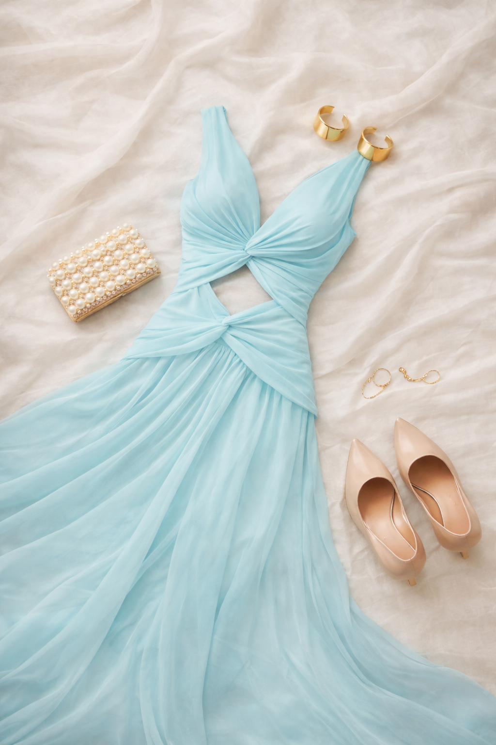 "Create a luxury fashion flatlay inspired by Bella Okagbue’s aqua evening gown. Place a flowing aqua chiffon or satin dress as the centerpiece, softly arranged to highlight elegant draping and gentle pleats. Style the dress with a pearl embellished clutch positioned beside the waist area to emphasize texture and timeless elegance. Add gold cuff bracelets placed symmetrically near the neckline area to reflect warm metallic accents. Include subtle beauty elements such as nude toned heels, soft glam makeup items in neutral packaging, and minimal gold jewelry to enhance sophistication without clutter."
