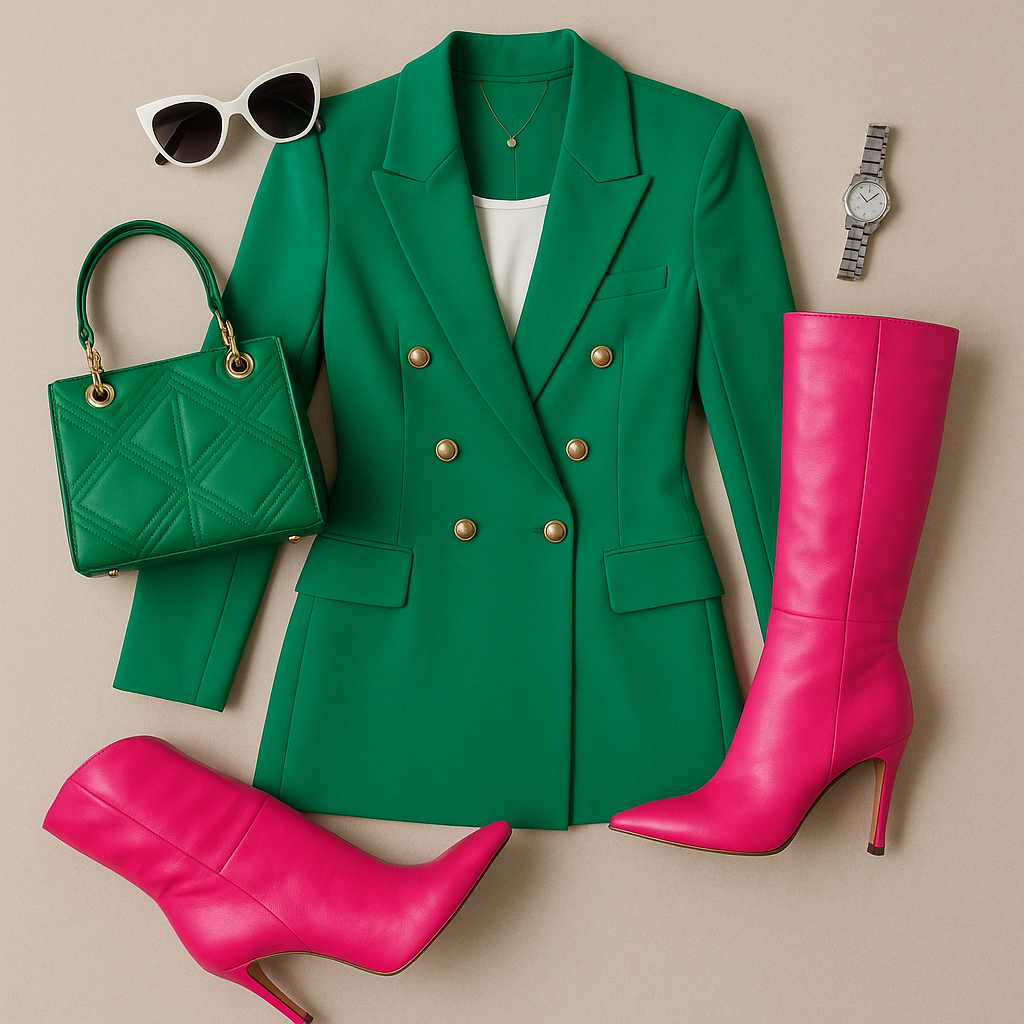 “Flat lay of a green double-breasted blazer dress with six gold buttons, a white vest layered underneath, hot pink knee-high boots, a quilted green handbag with gold hardware, oversized white sunglasses, a gold necklace, and a silver wristwatch styled on a warm beige background in a clean, editorial layout.