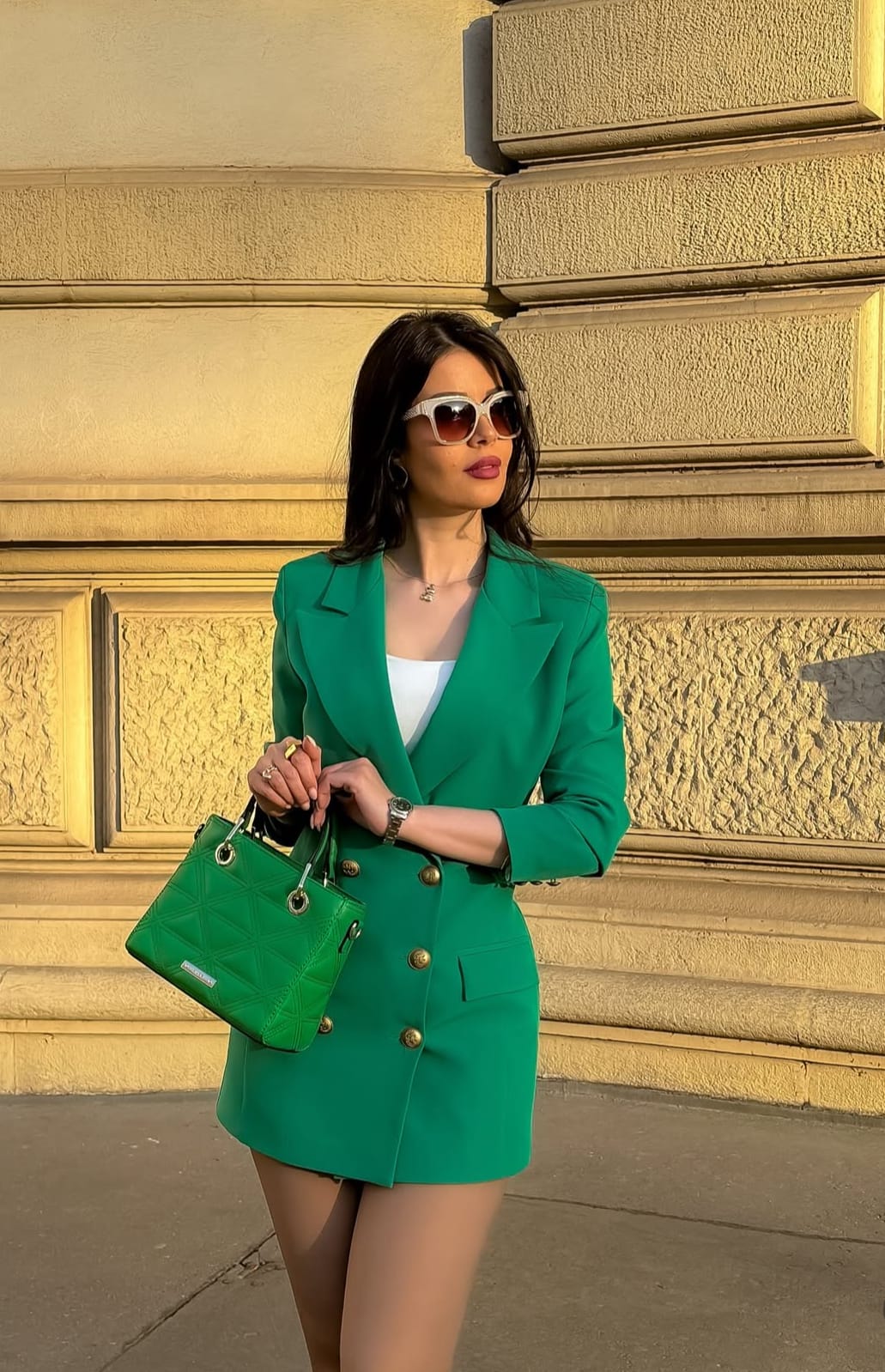 Accessories are kept intentional and chic. A quilted green handbag ties in with the blazer while offering its own quiet sophistication. Oversized sunglasses and minimal jewelry complete the look without overpowering it. The look walks a fine line between fierce and polished, and it nails it.