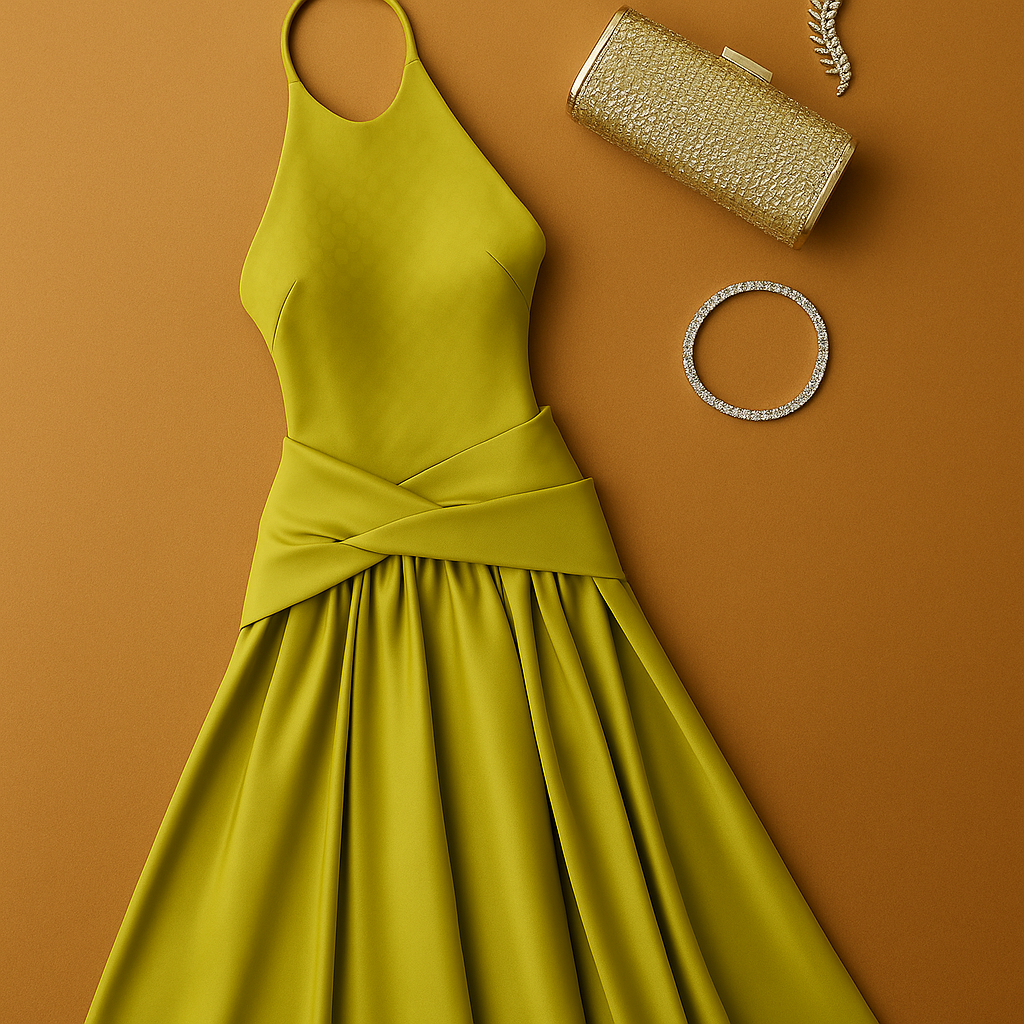 "Create a luxurious flatlay on a warm ochre background featuring an elegant satin lime green halter-neck evening gown with a fitted bodice, crossover waist detail, and a full draped skirt. Arrange the gown as the central focus, with smooth folds cascading naturally. Place a textured gold clutch with metallic hardware to the upper right for balance. Add a sparkling tennis bracelet and a crystal-embellished ear cuff positioned neatly beside the clutch to complete the ensemble."