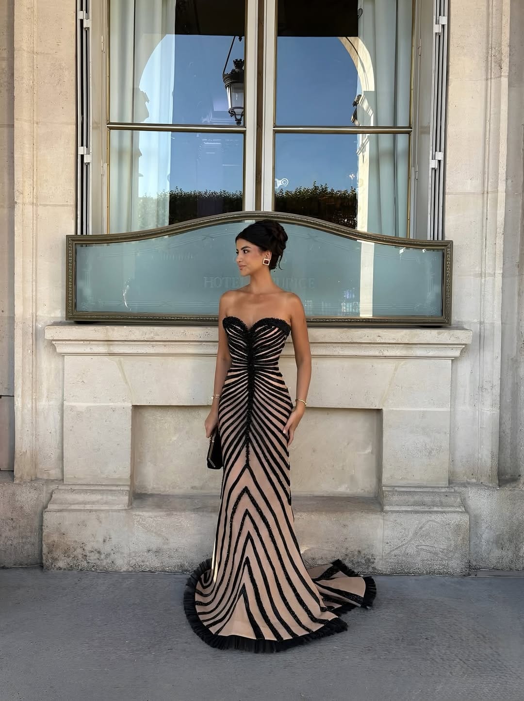 This look is ideal for readers who gravitate toward structured glamour and couture inspired detailing. It suits black tie galas, high profile weddings, luxury fashion events, red carpet evenings, and formal celebrations where statement gowns are embraced.