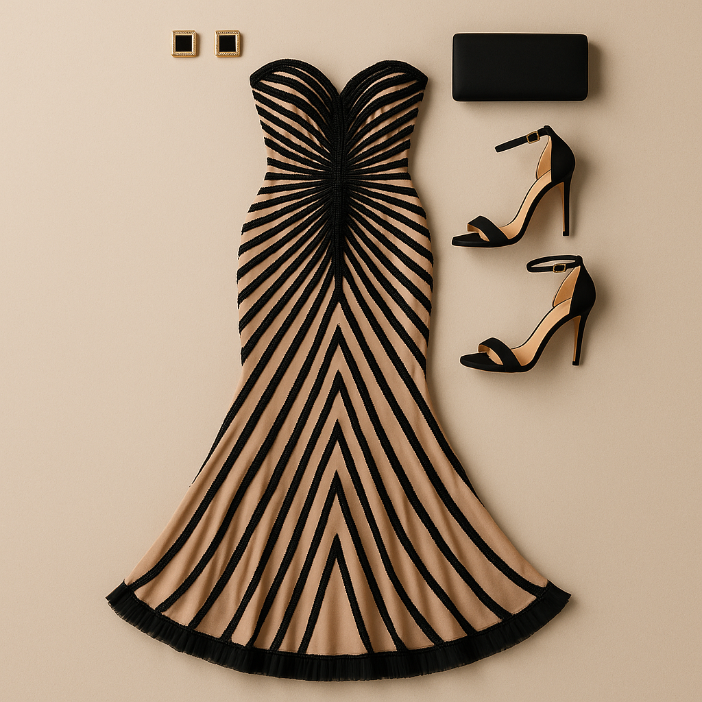 "Create a luxury flatlay of a couture nude evening gown with bold black geometric embellishments inspired by Ola Farahat. Arrange the strapless gown on a warm beige background to enhance contrast. The dress should feature a sweetheart neckline and dramatic black chevron lines radiating downward in a symmetrical pattern, with a slight flared hem trimmed in soft black ruffles. Place black high heel sandals with an ankle strap to the right of the gown, a sleek black clutch above the shoes, and square gold and black statement earrings at the top left."