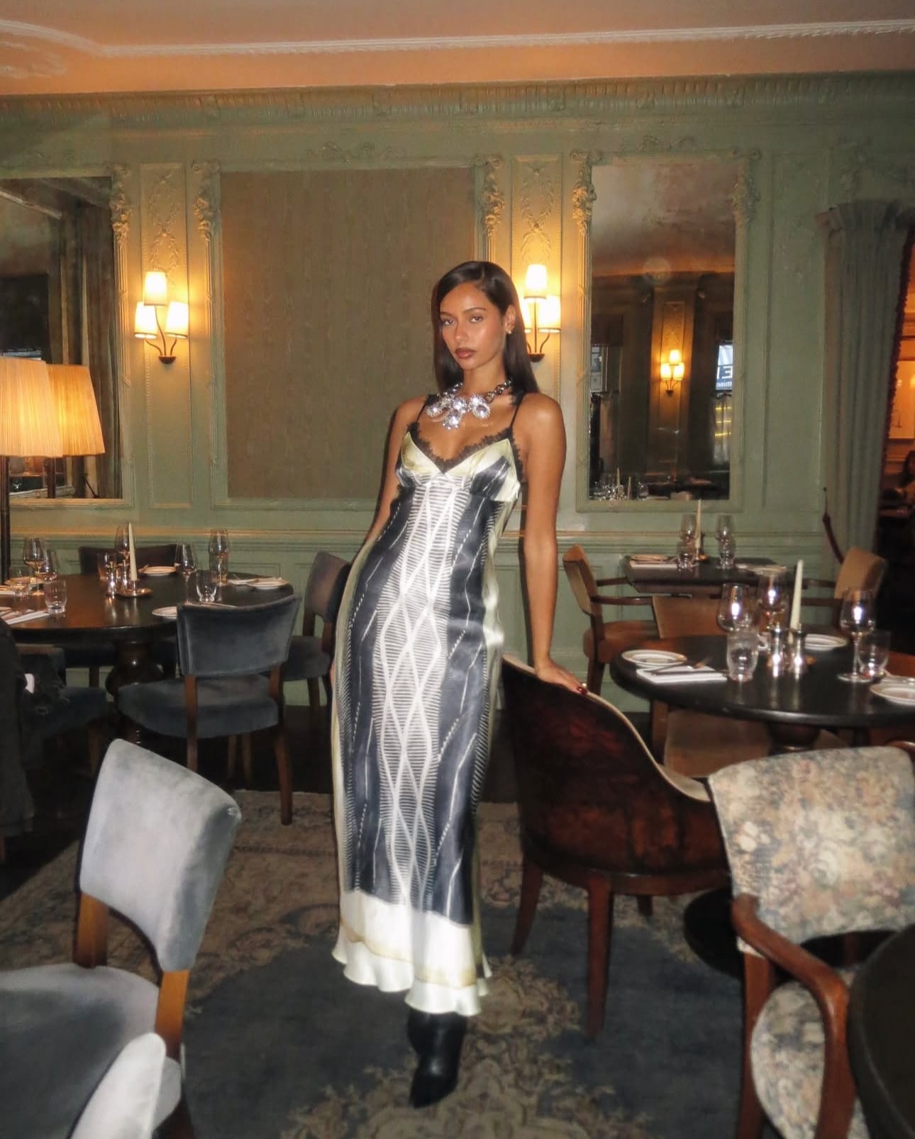 The first thing that captures your attention is the dress itself. It is a silky printed slip silhouette that hugs the body with fluid precision. The fabric has a luminous sheen, catching the light in a way that elevates the entire look. The print is a striking mix of linear patterns, soft gradients, and muted tones of charcoal, ivory, and sage. This unusual color palette adds depth and dimension, allowing the dress to read both modern and timeless.
