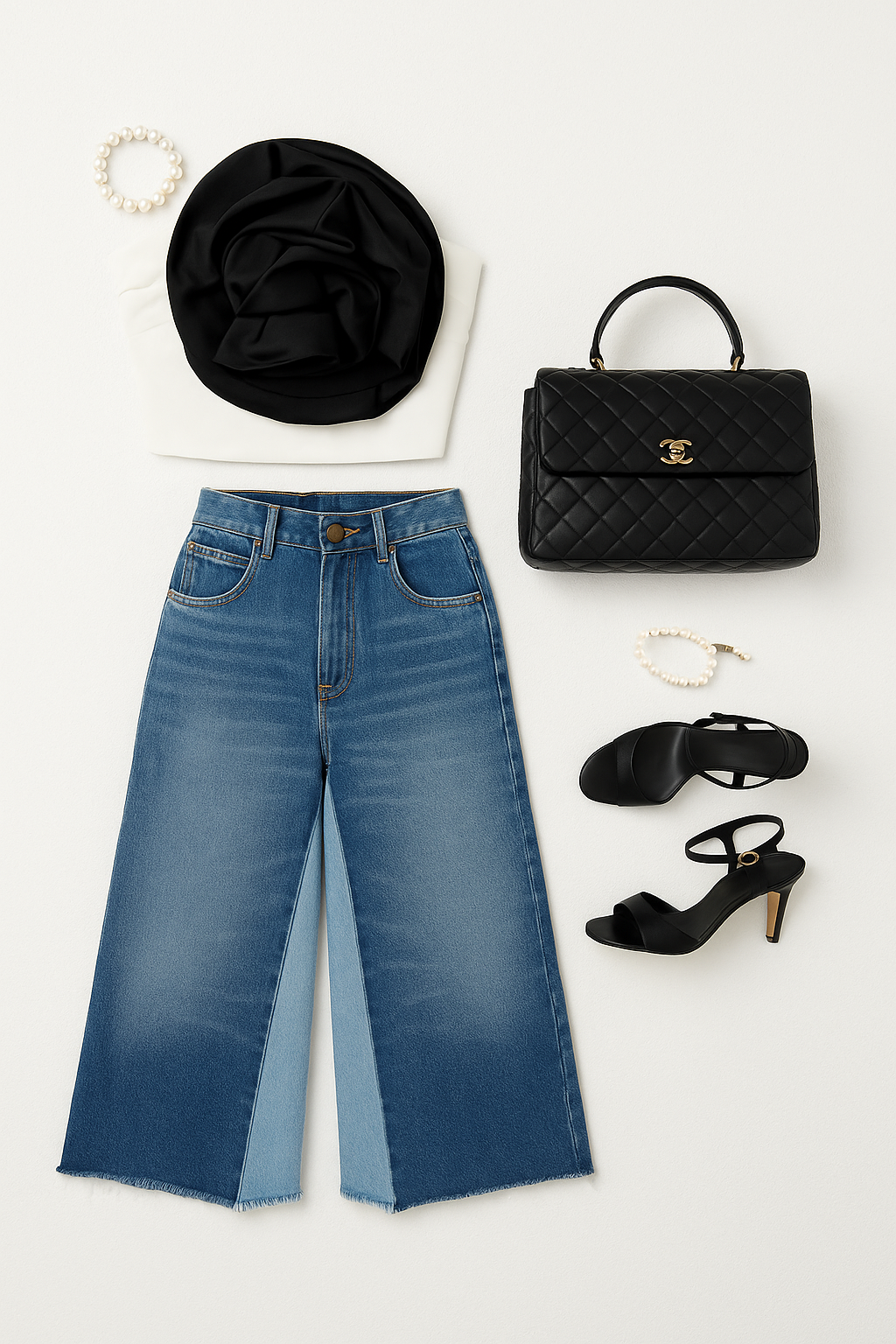 “Create a flat lay of an outfit featuring a white strapless top with a black rosette, patchwork denim culottes with a light blue contrast panel, a Chanel quilted bag, black open-toe heels, and pearl bracelets. Emphasize contrast, structure, and elegance.”