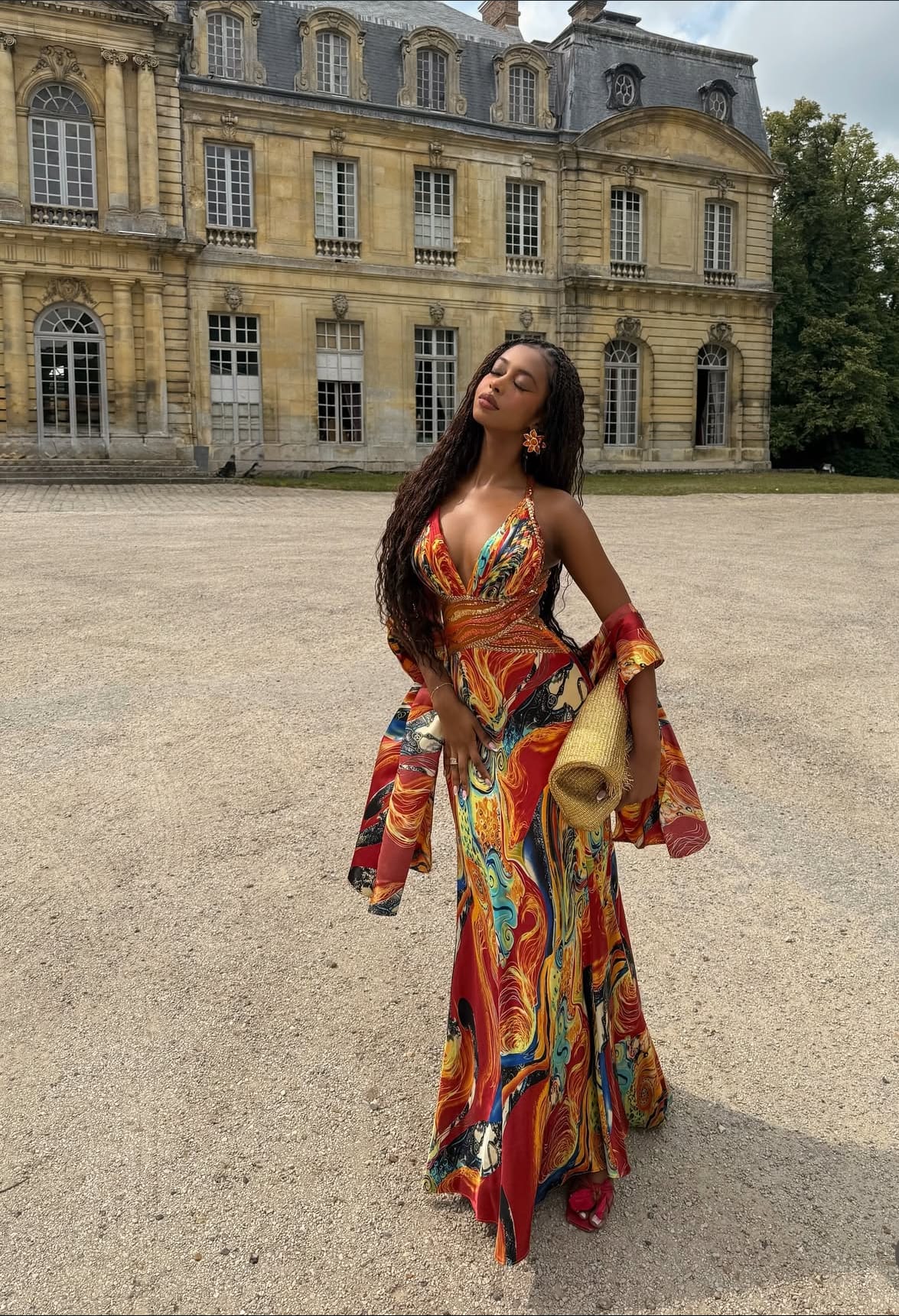 It was the fabric, however, that turned this ensemble into something extraordinary. A riot of swirling hues—fiery orange, sunlit yellow, sapphire blue, and deep red—collided across the gown in bold, painterly strokes. The print carried energy and movement, almost as though it were alive. Each fold of the dress revealed a new layer of the palette, giving the impression of a canvas reinterpreted with every step. Against the neutral tones of the château, the colors radiated with brilliance, transforming her into the focal point of every glance.