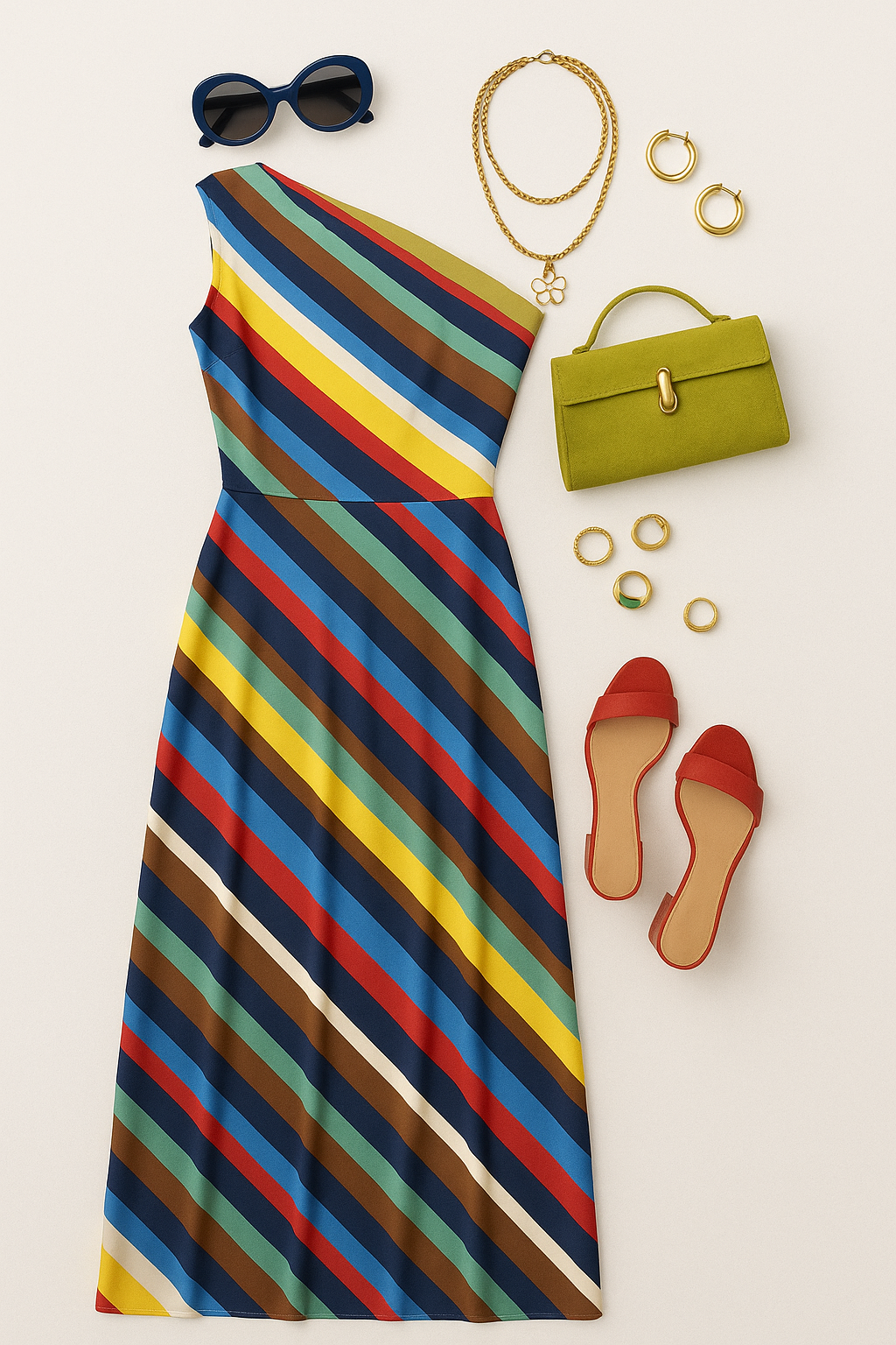 “A flat lay of a vibrant, diagonally striped one-shoulder dress in bold summer colors like red, yellow, blue, green, brown, and cream. The dress is paired with red open-toe block heel sandals, a chartreuse suede handbag with a gold clasp, oversized round navy sunglasses, layered gold chain necklaces with a daisy charm, chunky gold hoop earrings, and a mix of gold rings including one with a green stone. Everything is arranged neatly on a soft, neutral cream background. No shadows, no models, clean editorial lighting”