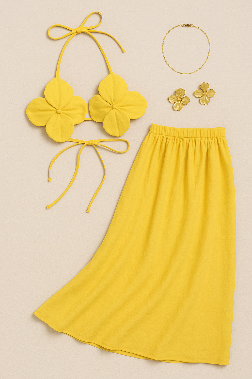 “A flat-lay image showcasing a yellow halter bikini-style top with two large flower petals as cups and thin string ties. Paired with a high-waisted, flowy midi skirt in matching yellow fabric. The flat lay also includes gold petal-shaped earrings and a delicate gold chain necklace. All elements are arranged on a clean, soft beige background with soft lighting, highlighting the vibrant yellow and gold details.Minimal and elegant composition, focusing on the outfit details.”