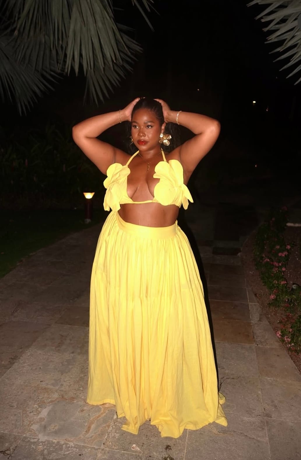 It’s sunshine bottled up and served with confidence. Zoey Chin Ioy’s look is the perfect blend of statement and simplicity where bold petals bloom unapologetically, yet every detail feels thoughtfully effortless. The bikini-style top flirts with the breeze, while the flowy high-waisted skirt dances with every step. Together, they create a rhythm that feels part vacation, part editorial, and fully unforgettable.