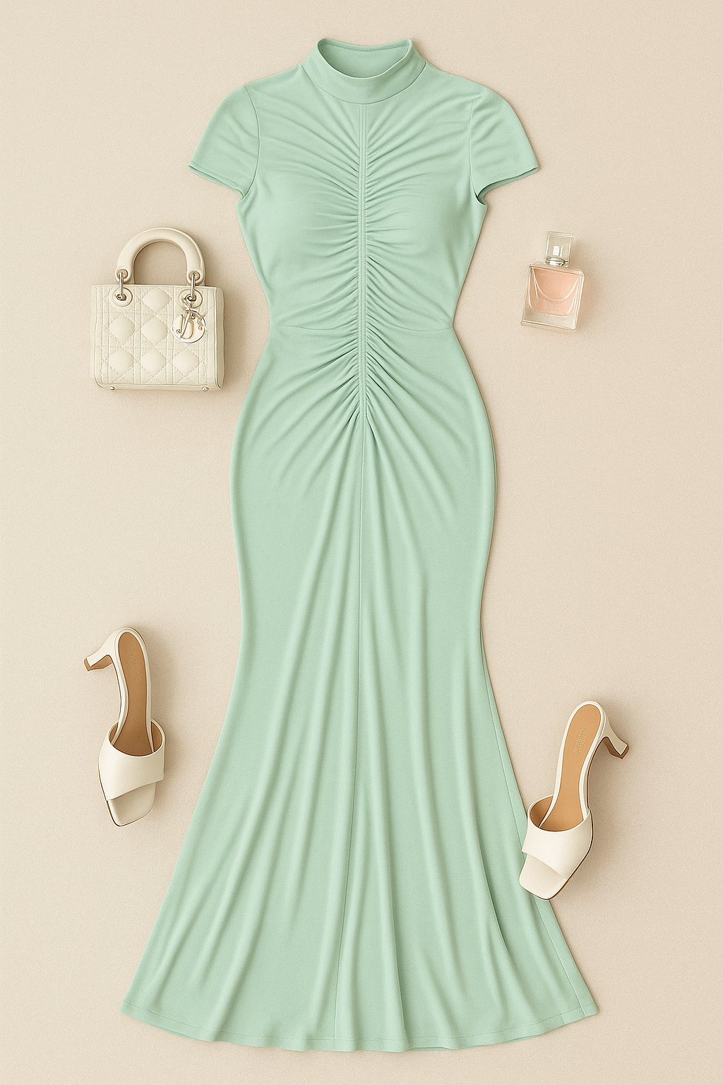 “A minimalist flat lay of a soft mint ruched evening gown with a high neckline, displayed elegantly on a neutral beige background. Include ivory open-toe heeled sandals on each side of the hem, a cream Lady Dior handbag on the left of the bodice. The lighting should be soft and airy, highlighting the flow and texture of the fabric. The overall tone should feel elegant, refined, and European chic. No text, no shadows, no models”