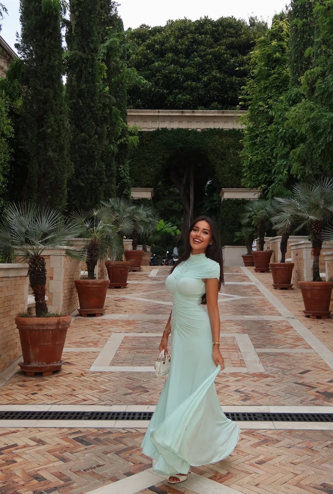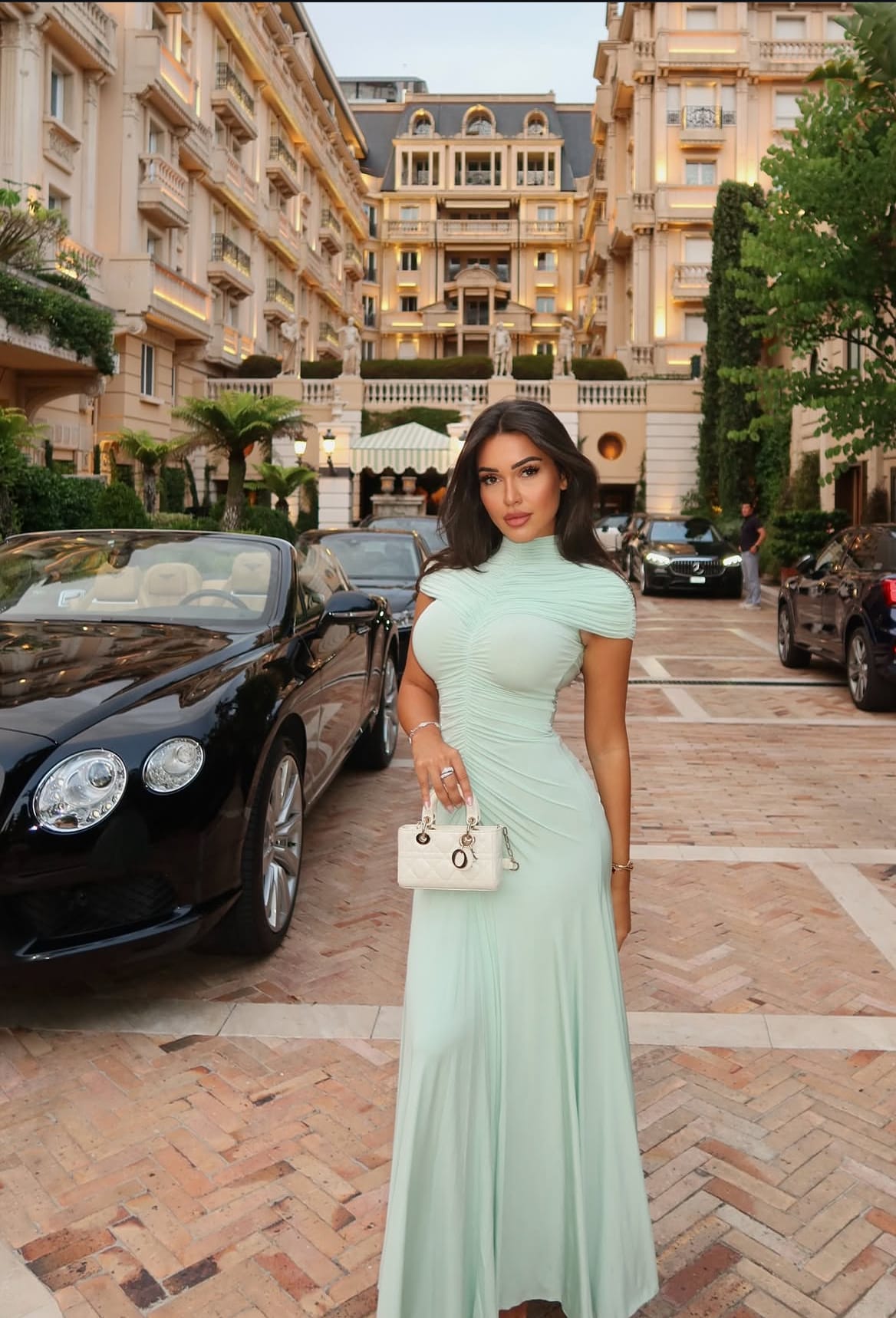 The gown’s meticulous tailoring reflects a mastery of fit and refinement, aligning perfectly with Milan’s storied tradition of sartorial excellence. The minimal accessorization chosen to accompany this dress was perfection: a petite, elegant ivory Lady Dior handbag paired with understated white heeled sandals. Delicate bracelets adorn the wrists, complementing without overshadowing the gown’s innate beauty.