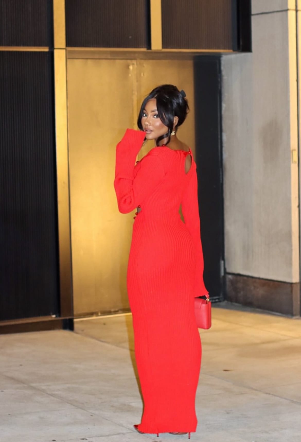 Charlotte Kamale’s choice of the Hanifa Nikita Maxi II Dress is a stunning ode to modern sensuality and architectural design in fashion. Crafted in a vivid, fire-red ribbed knit, this dress transforms the simplicity of a maxi silhouette into something unforgettable. The fabric molds to her figure with precision, offering a sleek, elongated line that celebrates her shape while giving the bold color room to shine.