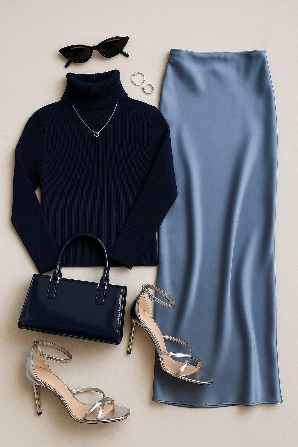 “Create a flat lay of an elegant monochrome blue outfit. Include a deep navy ribbed turtleneck sweater folded neatly. Add a silky periwinkle satin skirt arranged in a gentle curve to show its smooth texture. Place a structured patent navy handbag diagonally near the skirt. Include one pair of silver strappy heels positioned elegantly at the bottom. Add minimal silver jewelry — a thin bangle, a simple ring, and hoop earrings placed near the top section. Finish with black cat-eye sunglasses at the top corner for a modern touch. Lighting should be soft and balanced to highlight texture differences between knit, satin, and leather. The overall tone should feel calm, luxurious, and editorial”