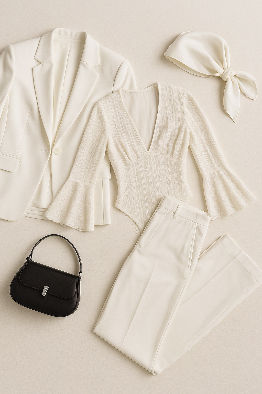 “A minimalist flat lay of Thanya’s monochrome Milan outfit. Include a crisp ivory tailored blazer draped neatly, wide-leg white trousers folded with clean lines, and a lace-textured deep V blouse with flared sleeves arranged elegantly. Add a silky ivory bandana placed alongside, and a structured black leather handbag positioned as the anchor accessory. The background should be soft beige or ivory, keeping everything sharp, polished, and fashion-forward. No models, just the items arranged in a flat lay style.”