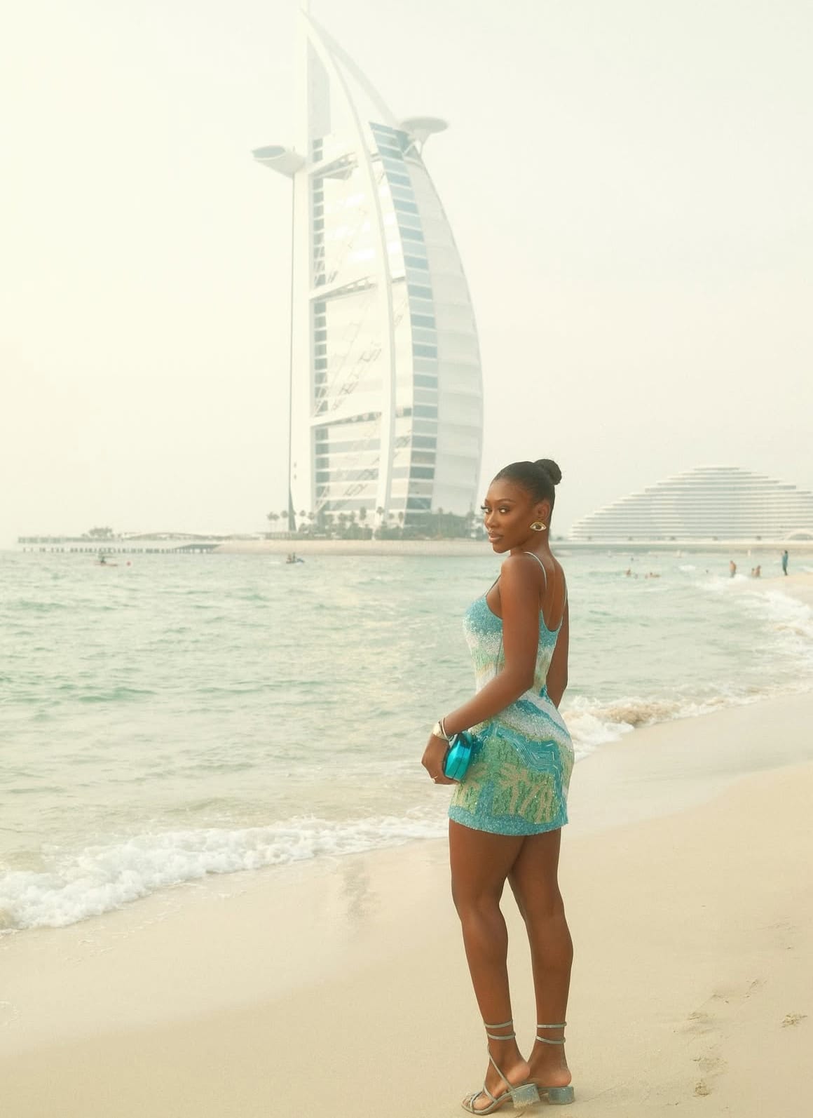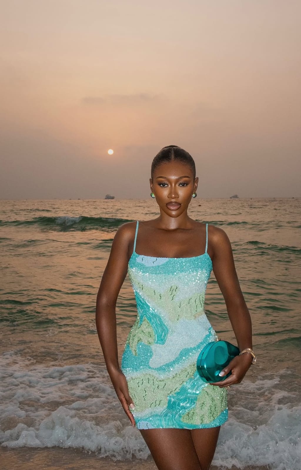 The star of the ensemble, a form-fitting mini dress, is nothing short of artistry in fabric form, capturing the gentle ebb and flow of ocean waves through intricate beadwork and subtle sequins. The hues of the dress are a harmonious blend of teal, aqua, seafoam, and soft silvers, reminiscent of sunlight dancing on a calm sea. Delicately placed beads catch the light from every angle, creating a shimmering effect akin to sunlit ripples. The meticulous detailing, from the gentle curvature of the patterns to the strategic placement of colors, enhances her natural elegance, while the spaghetti straps and squared neckline highlight her graceful shoulders and décolletage.