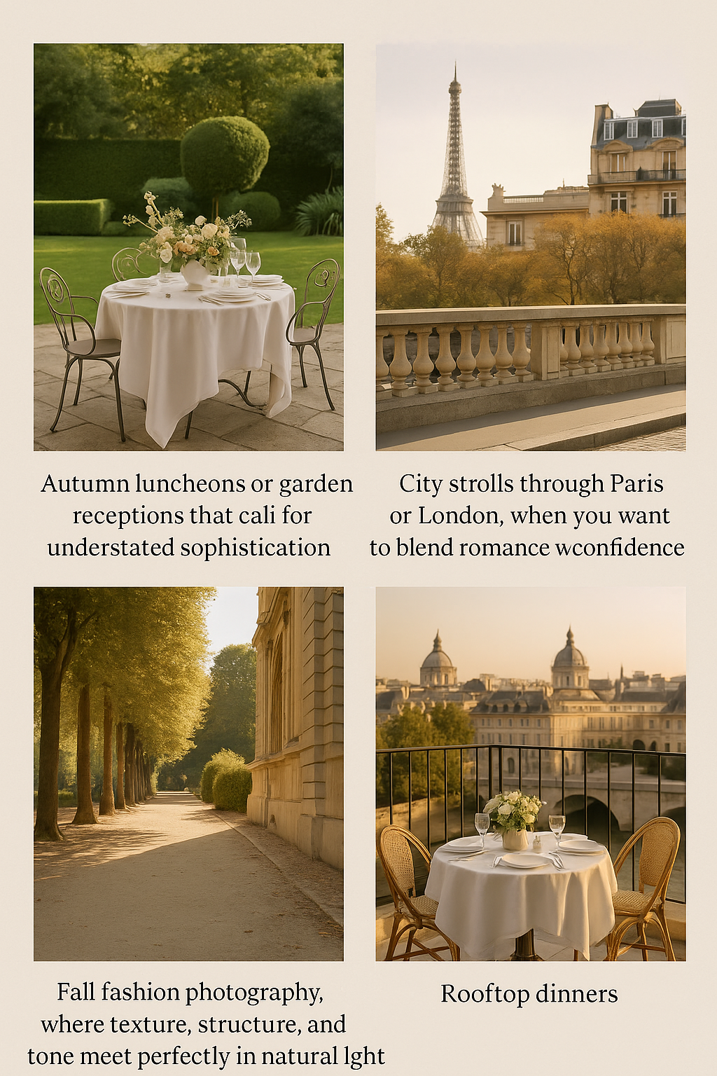 • Autumn luncheons or garden receptions that call for understated sophistication