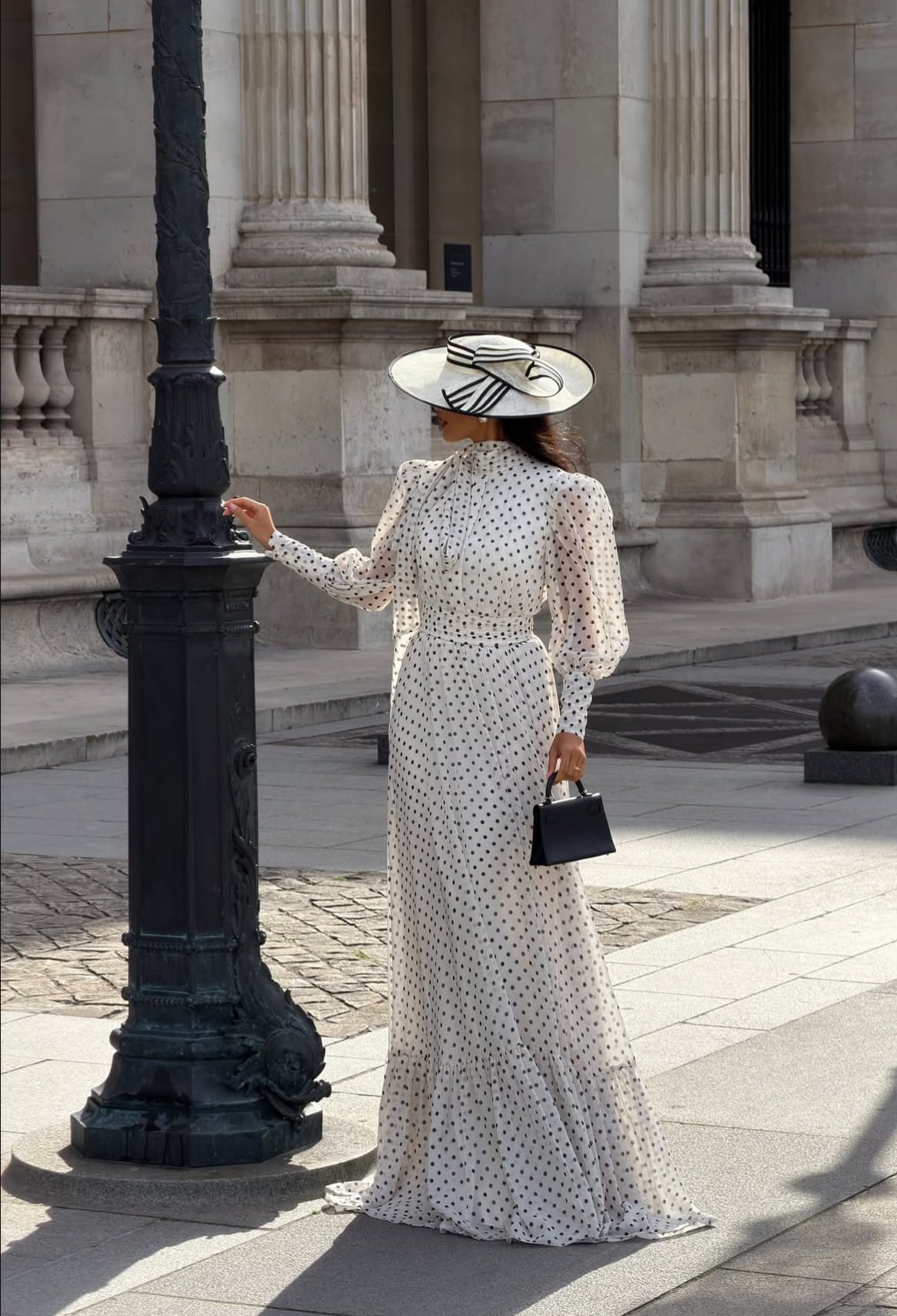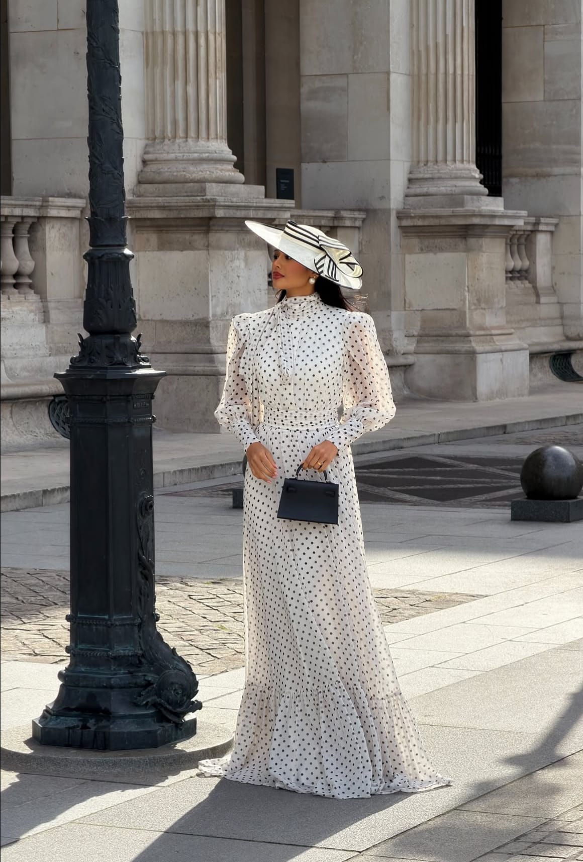 Pat’s ivory gown with delicate black polka dots feels like poetry in motion. The high neckline gathers neatly at the throat, creating an image of classic refinement. The long, sheer bishop sleeves add a touch of romance as they move with the breeze. Each detail has been placed with care, from the subtle waistline that elongates her frame to the flowing skirt that glides effortlessly over the pavement. The entire look feels both structured and soft, the kind of dress that belongs to slow walks beneath golden leaves and quiet moments spent admiring art.