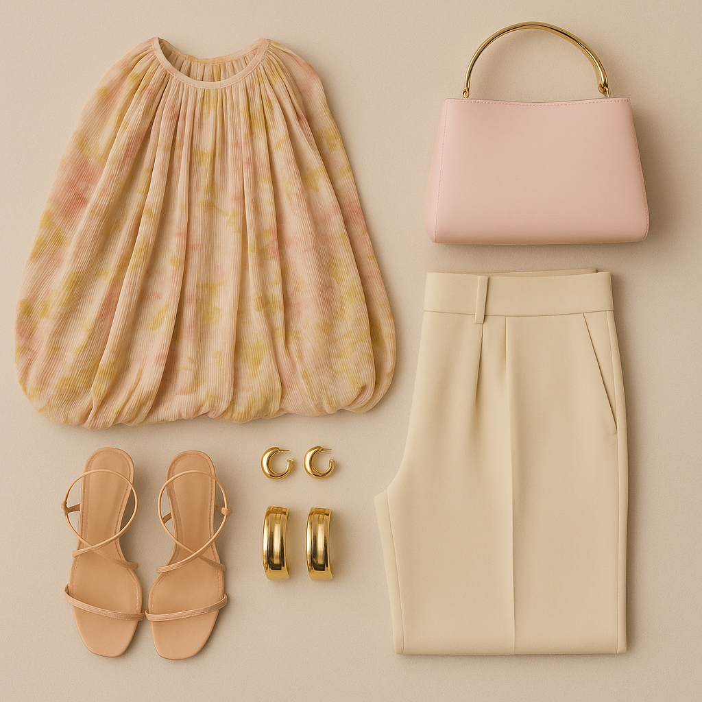“Flat lay of a pleated floral cape top, cream high-waisted trousers, nude strappy heels, two gold cuffs, small gold hoops, and a blush pink handbag with a gold handle, styled on a warm beige background.”