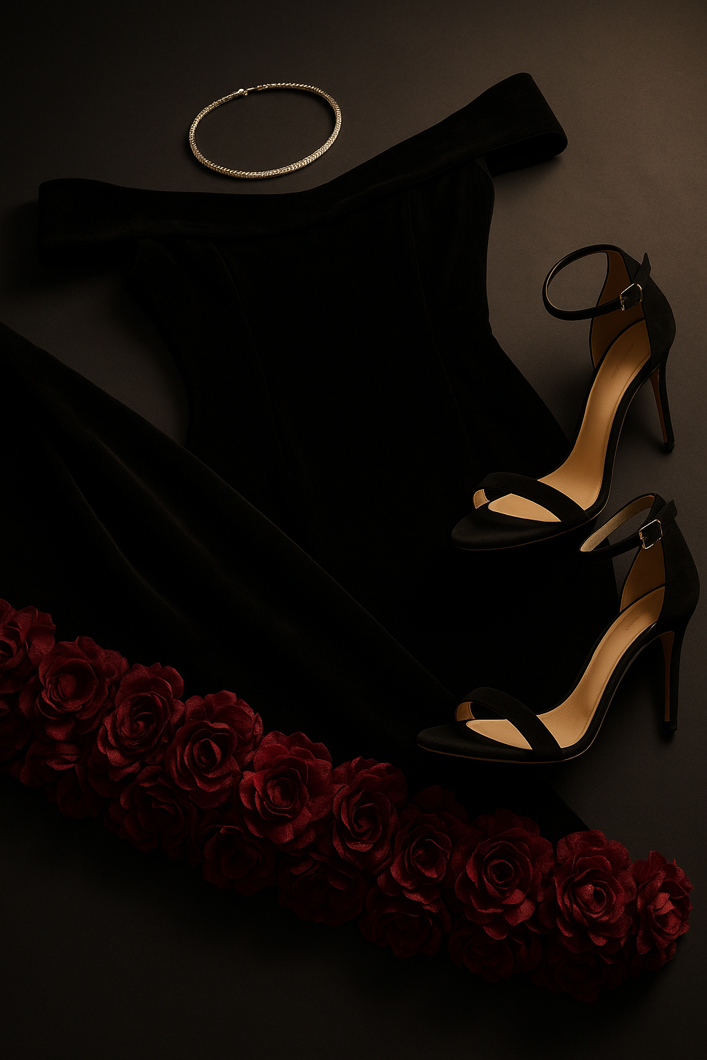 "Create a luxurious flatlay showcasing an evening ensemble inspired by a black velvet off shoulder gown with a deep berry red rosette hem. Arrange a folded section of rich black velvet fabric as the base to mimic the dress texture. Add a trim of layered dark red fabric rosettes along one edge to reflect the dramatic floral detailing of the hemline. Include elegant black strappy high heels with a slender ankle strap positioned beside the fabric. Add a delicate silver choker with subtle sparkle, placed neatly at the top of the arrangement. Incorporate a soft spotlight effect to enhance the velvet sheen and the depth of the red rosettes."