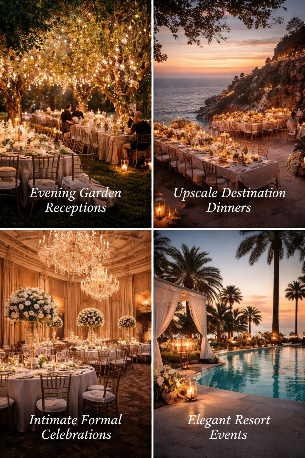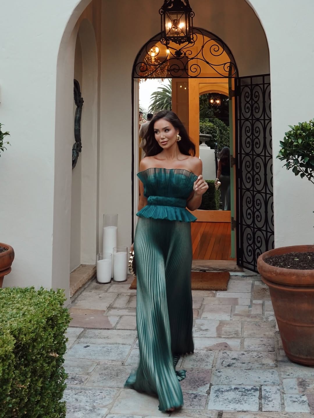 This look is ideal for evening garden receptions, upscale destination dinners, intimate formal celebrations, and elegant resort events. It suits someone who values refined femininity, subtle glamour, and movement driven silhouettes.