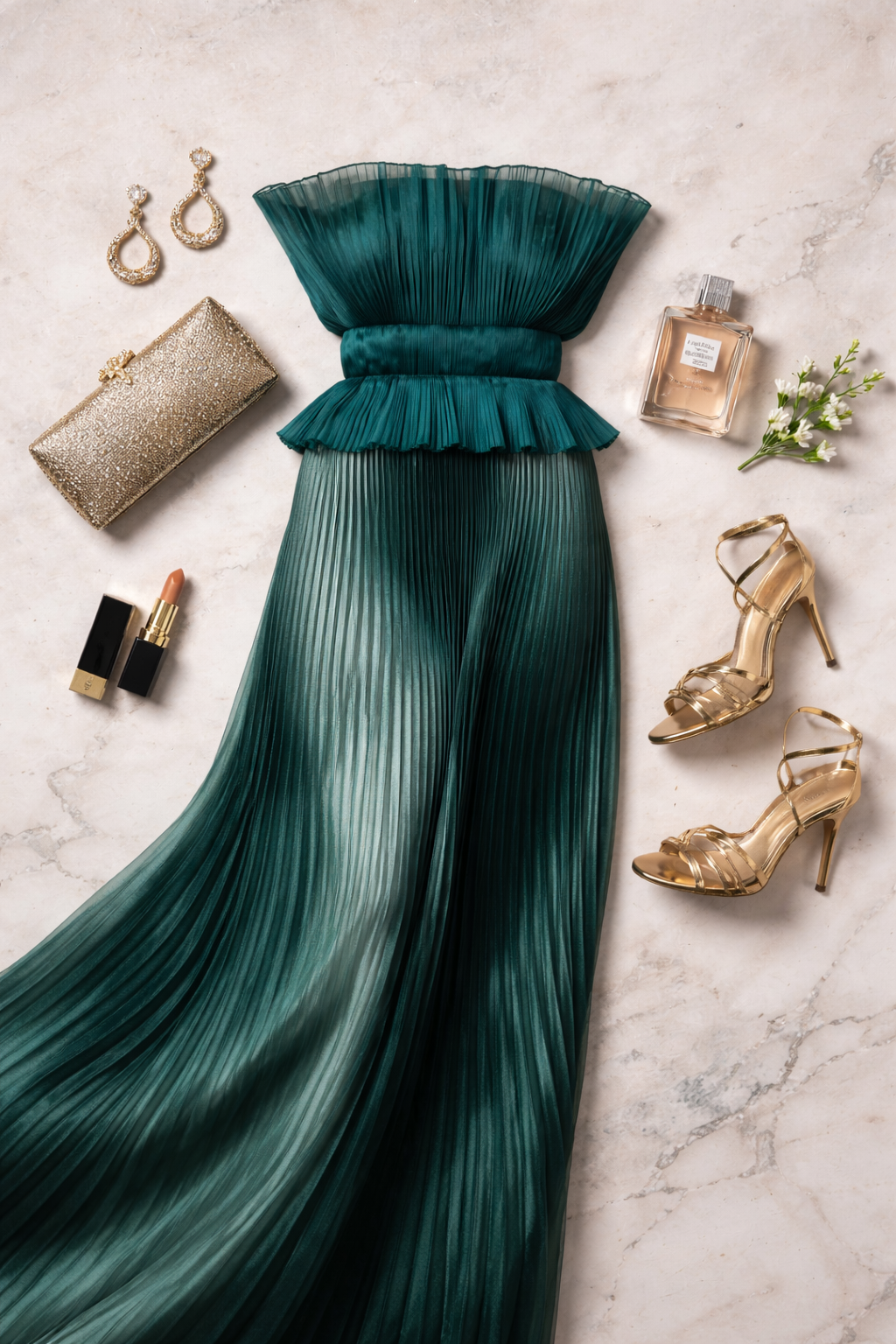 "Luxury fashion flatlay of an emerald teal pleated evening gown with an off shoulder bodice and structured peplum waist, arranged neatly on a soft neutral marble or stone background. The dress is fully visible from top to hem with flowing pleats spread naturally. Styled with elegant gold strappy heels, a crystal embellished clutch, statement gold earrings, and a minimalist perfume bottle."