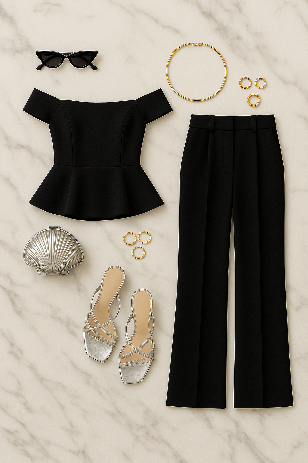 “Create a flat lay image on a light marble background featuring a structured black off-the-shoulder peplum top and matching high-waisted wide-leg trousers. Style it with silver strappy square-toe heels, a silver shell-shaped clutch, a sleek gold choker necklace, three gold rings grouped together, and a pair of black cat-eye sunglasses. Keep the composition clean, minimal, and luxurious. No models, no text, no additional props.”