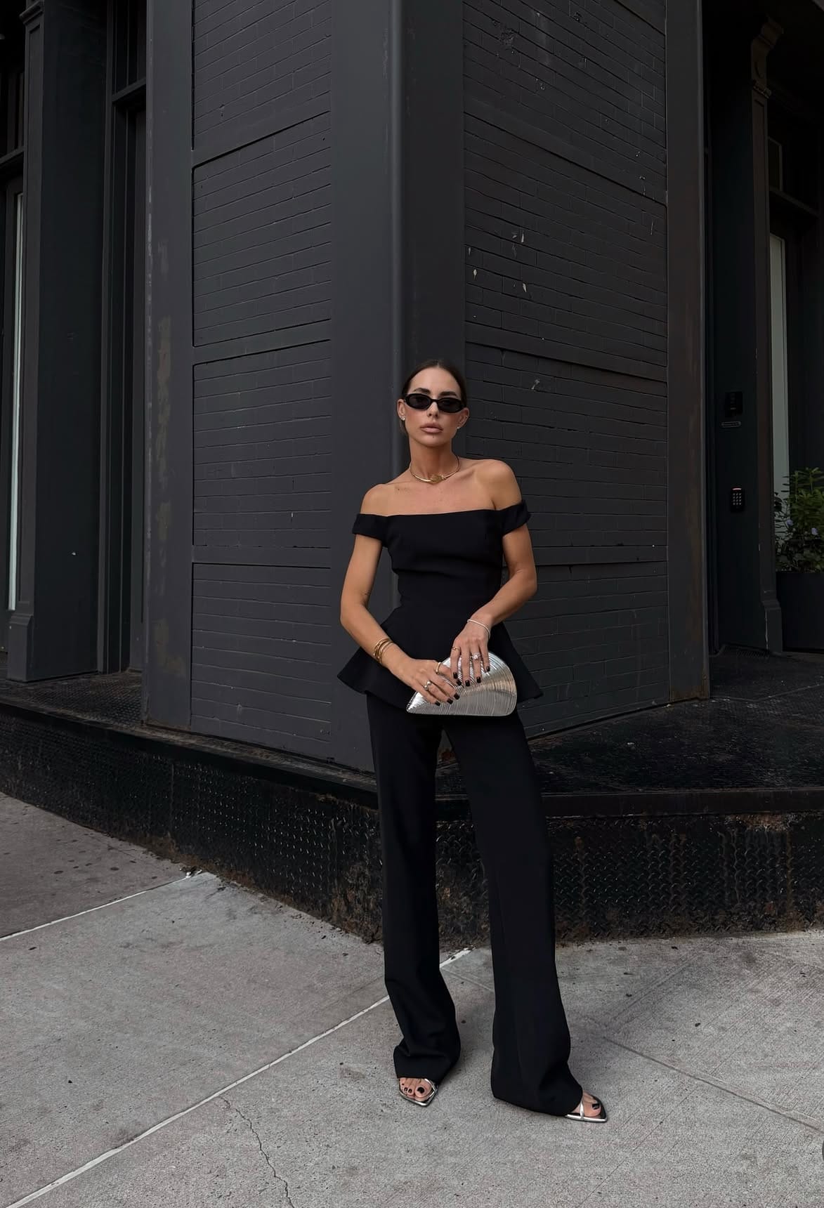 This ensemble kicks off with an off-the-shoulder black top, expertly cut to highlight the collarbones and shoulders with precision. The bodice is fitted, creating a sense of tailored strength, while the waist breaks out into a peplum that flares with intention—not too much, but just enough to create a sculptural silhouette. This isn’t your basic black top; it’s a statement piece that balances femininity and power.