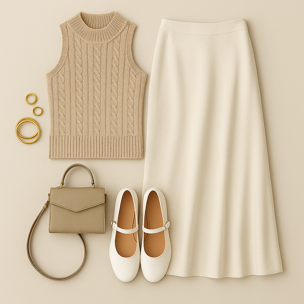 “Minimalist flat lay of a sleeveless beige knit top, ivory midi skirt, white Mary Janes flats, taupe mini bag, and gold jewelry on a warm neutral background.”