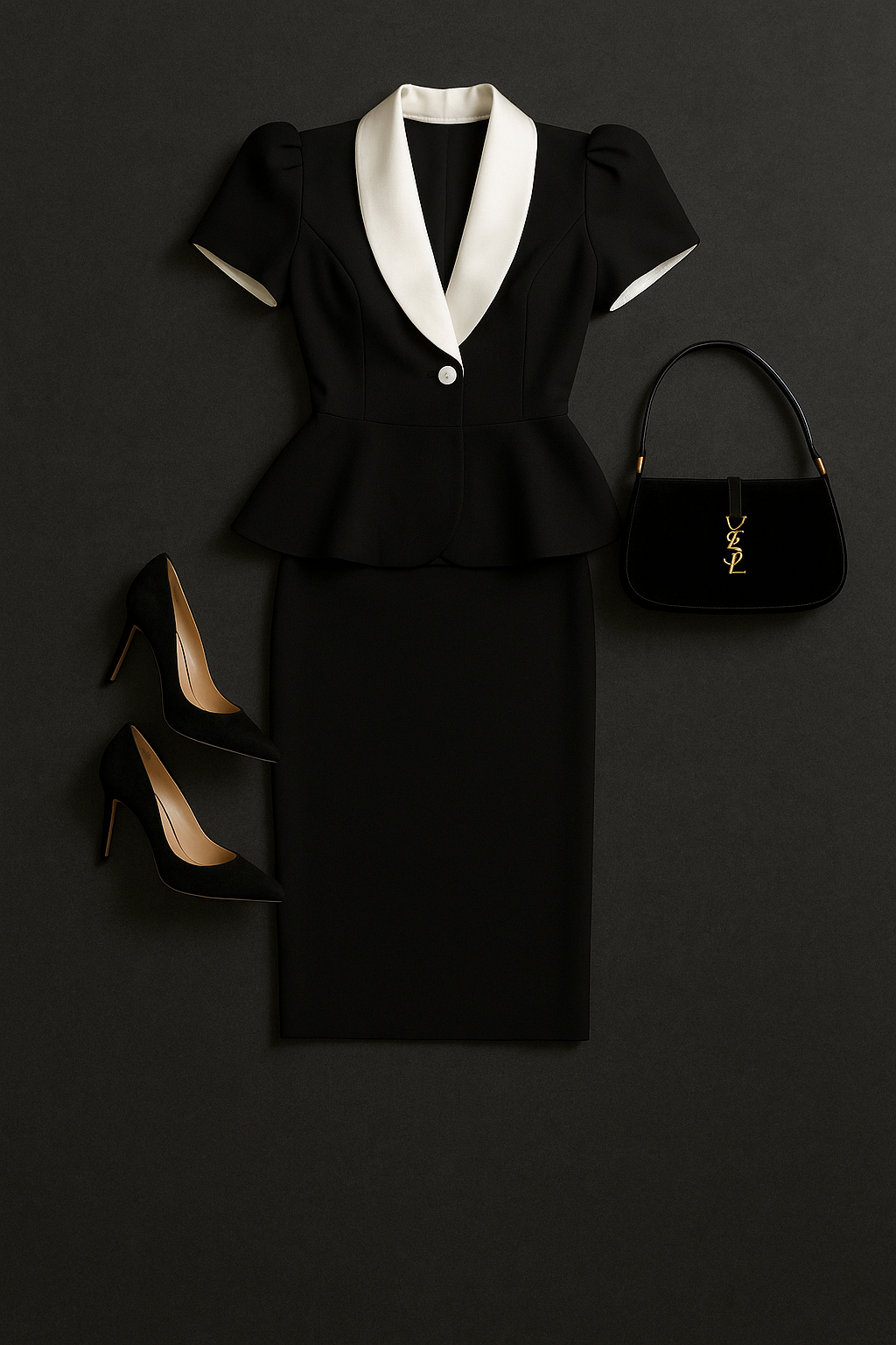"A luxurious flatlay of a refined black and white outfit styled for a sophisticated woman. Include a black tailored peplum blazer with a white satin shawl collar, a fitted black pencil midi skirt, black pointed-toe heels, a black velvet YSL handbag with a gold logo, and minimalist black rectangular eyeglasses. Arrange them symmetrically on a matte dark background with soft lighting to create a polished, high-fashion editorial feel. The image should exude elegance, minimalism, and precision — reflecting timeless modern grace."