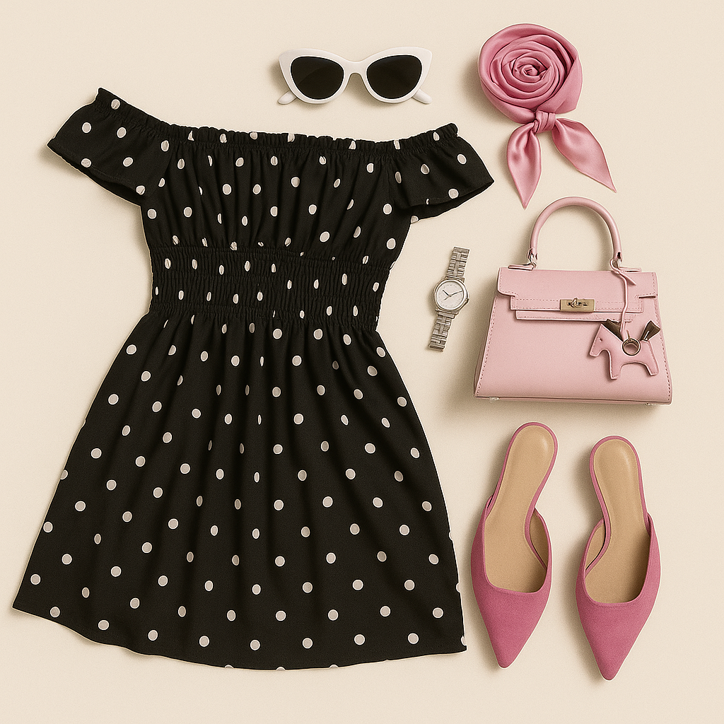 “Flat lay of a black off-shoulder mini dress with white polka dots and shirred waist, styled with cat-eye white sunglasses, a silver wristwatch, a pink silk scarf arranged like a rose, a structured pastel pink handbag with a horse-shaped charm, and pink pointed-toe slip-on flats all laid on a light neutral background in a clean, editorial arrangement.”