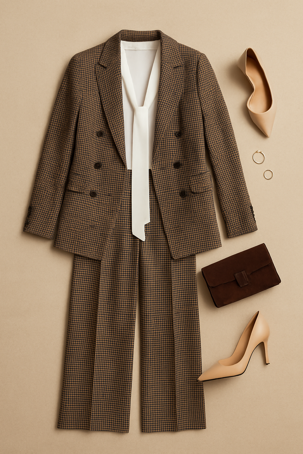 “A high-fashion flatlay of a tailored womenswear ensemble styled for an editorial fashion magazine. The outfit is carefully arranged to show structure and flow: a tailored blazer laid open, wide-leg trousers aligned beneath, and a soft blouse folded to highlight the neckline. Accessories include a structured leather clutch, minimalist gold jewelry, and pointed-toe heels placed diagonally for balance.”