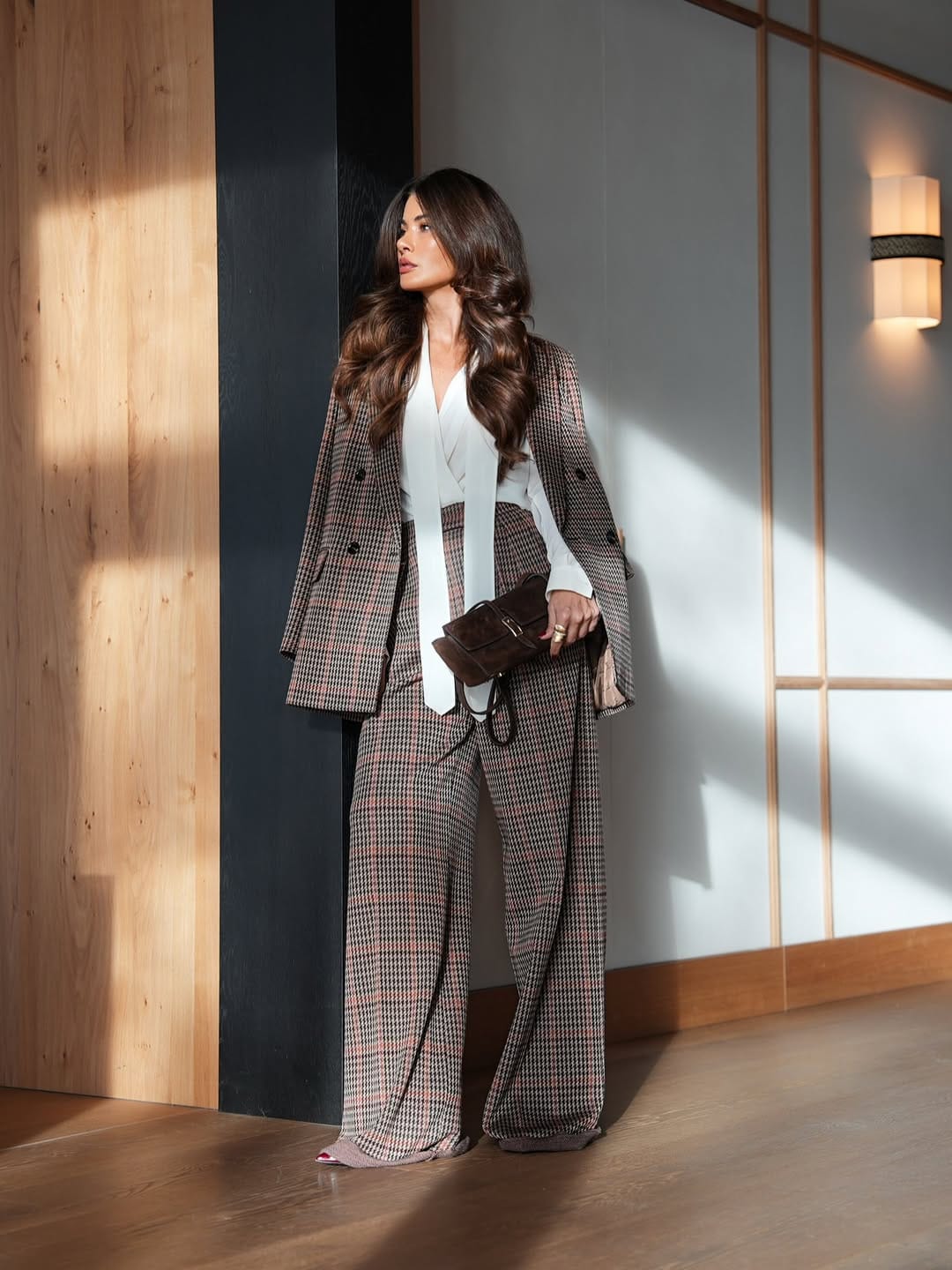 Fusun Lindner’s outfit speaks in a calm, confident language that blends classic tailoring with contemporary femininity. At first glance, the look feels rooted in tradition, yet every detail has been refined to suit a modern sensibility. The ensemble centers on a coordinated suit rendered in a subtle check pattern, immediately setting a tone of understated sophistication. The color palette leans into warm neutrals, with shades of brown, taupe, and soft charcoal woven together, creating visual depth without overwhelming the eye.