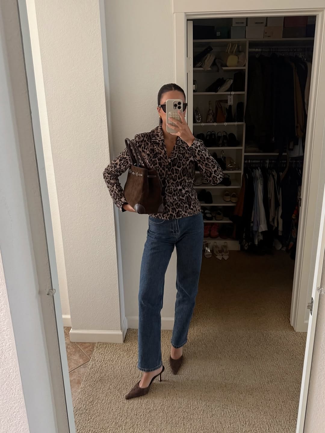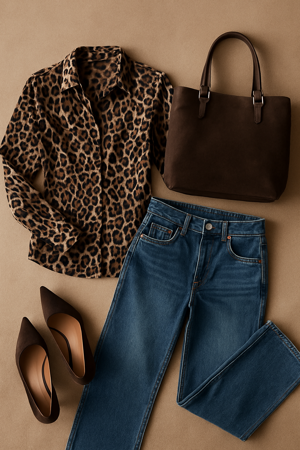 "A minimalist editorial flatlay featuring a leopard print blouse with a soft sheen, classic straight-leg blue jeans, brown suede pointed-toe heels, a single brown suede tote bag, and subtle gold jewelry including thin bangles and small hoop earrings. Arrange the items on a neutral beige or cream textured background with warm natural lighting. The composition should feel clean, stylish, and sophisticated, emphasizing the textures of fabric and accessories while maintaining a cohesive modern aesthetic."
