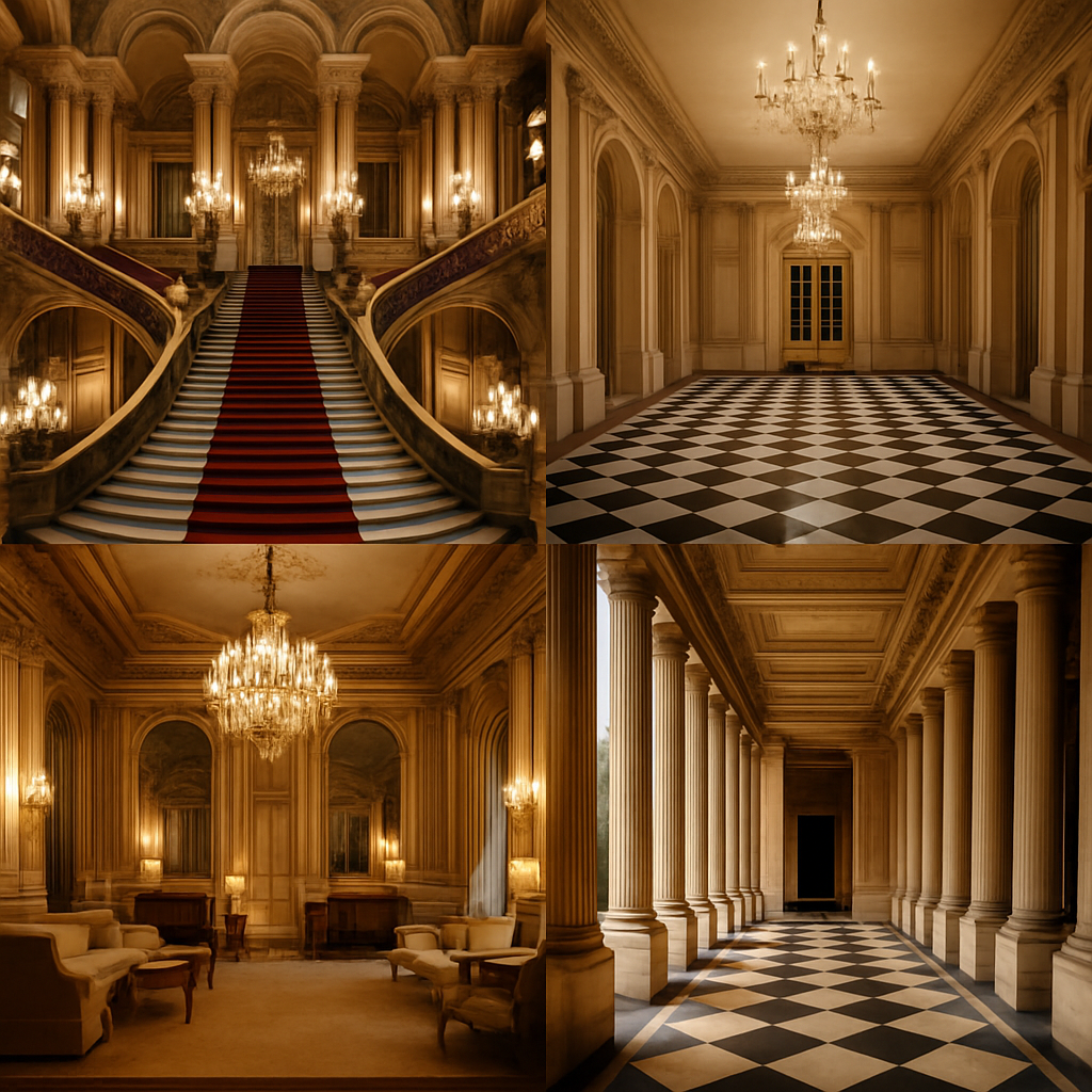 The first impression of the outfit is unmistakably sleek. Leonie stands against towering classical columns in what appears to be a historical Parisian palace or grand architectural location, the stone pillars serving as a backdrop that elevates the clean silhouette of her ensemble. The contrast between the creamy stone and her black gown immediately draws the eye to her shape, highlighting the harmony between the environment and the styling.