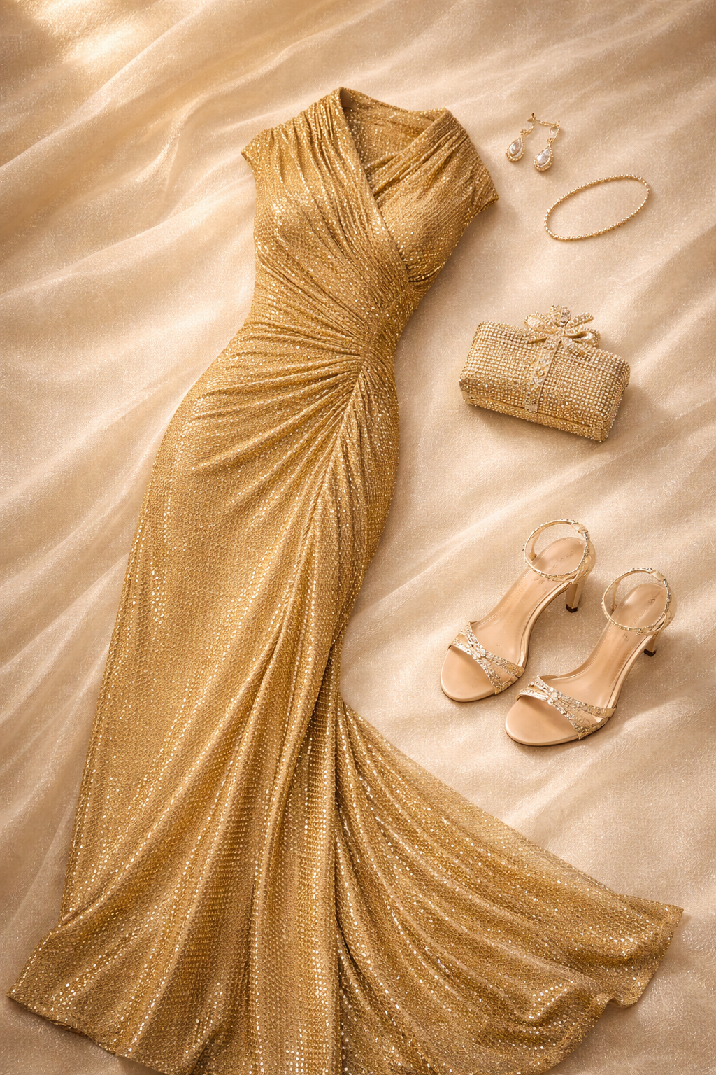 "Create a luxury fashion flatlay centered on a floor length gold evening gown with a wrap style bodice, soft ruching through the waist, and a slim column silhouette. The fabric should appear richly textured with fine metallic beading or sequins that catch light subtly rather than sparkle harshly. Lay the gown diagonally on a warm champagne or antique gold fabric background with a soft woven texture to echo the richness of the dress. Style the ensemble with a small structured gold or crystal embellished handbag placed near the waist area, delicate gold earrings, and a minimal gold bracelet arranged with intentional spacing."