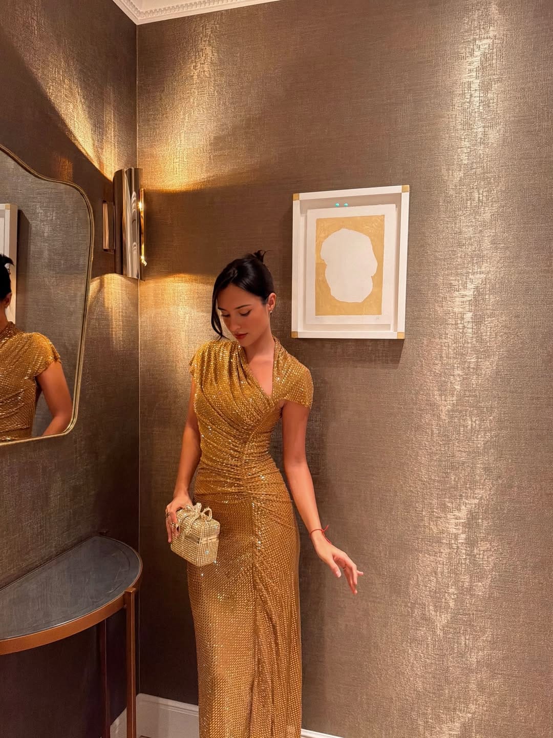 Alexandra Saint Mleux is presented in a look defined by warmth and precision, where glamour is expressed through craftsmanship rather than display. The gown itself commands attention with quiet confidence, rendered in a gold tone that appears almost luminous. Sitting between champagne and antique gold, the colour carries a sense of heritage and refinement, long associated with celebration and enduring elegance. Softened by ambient light and its surrounding textures, the finish feels rich without excess, allowing the dress to glow rather than shine.