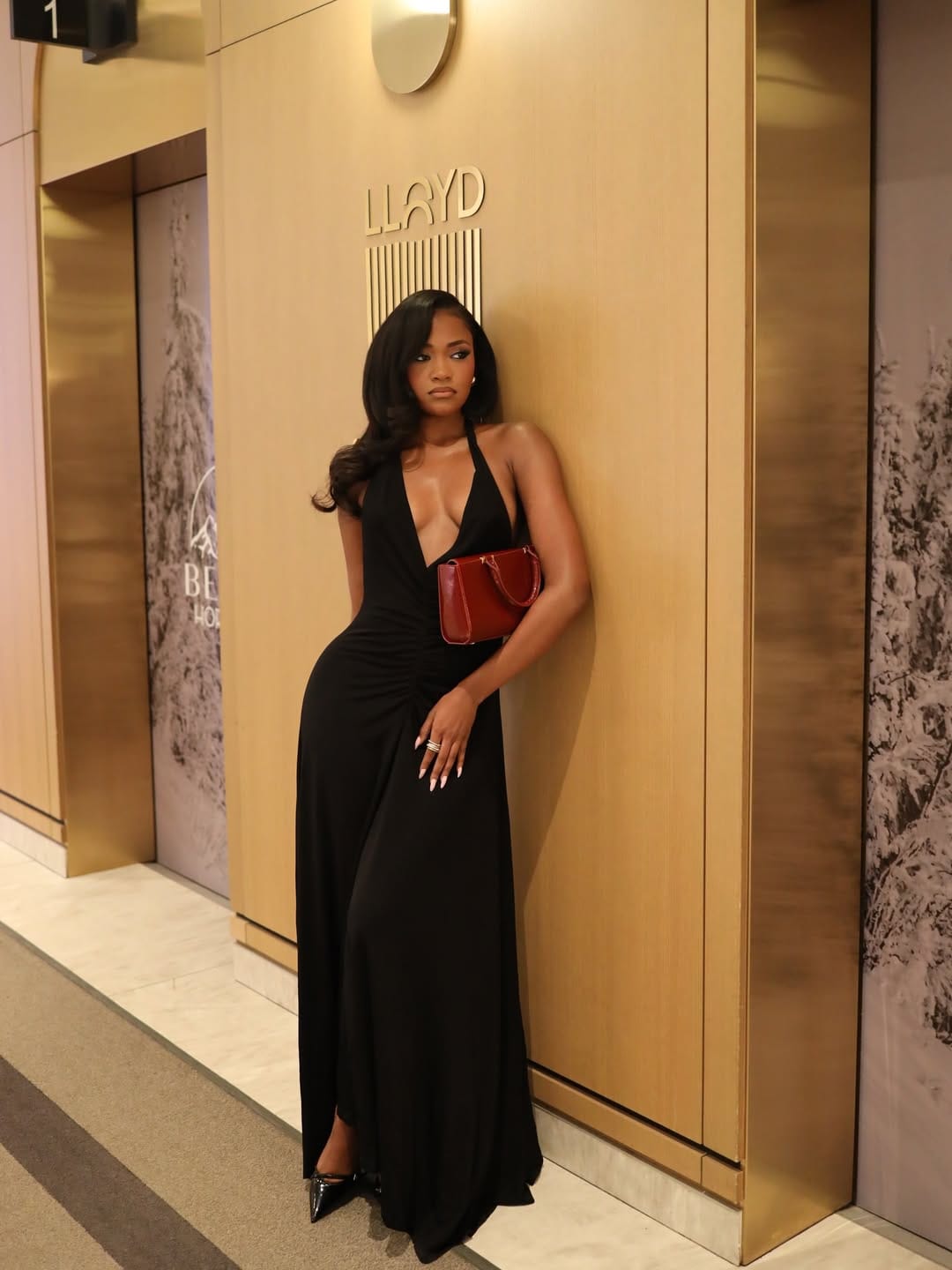 Styling choices elevate the look without competing with it. The red clutch introduces a controlled contrast that feels deliberate and confident. Against the black dress, the rich red leather becomes a focal point, adding warmth and depth to the palette. It breaks the monochrome just enough to keep the look from feeling severe, while still maintaining its polished edge. The size and structure of the bag suggest intention rather than practicality. It feels chosen for effect, not convenience.