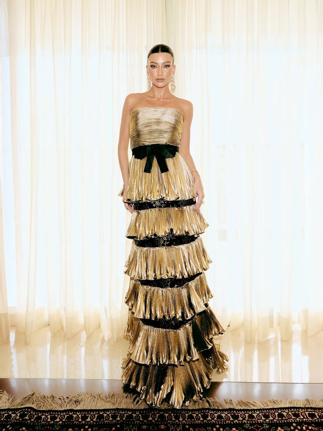 This look is perfect for readers drawn to extravagant eveningwear with thoughtful structural detailing and a love for fabric that behaves like art. It is suited to galas, award ceremonies, upscale celebrations, and elegant seasonal events where shimmering gold and sculptural silhouettes feel right at home. Anyone seeking inspiration for statement dressing that combines femininity with couture level craftsmanship will find this look irresistible.