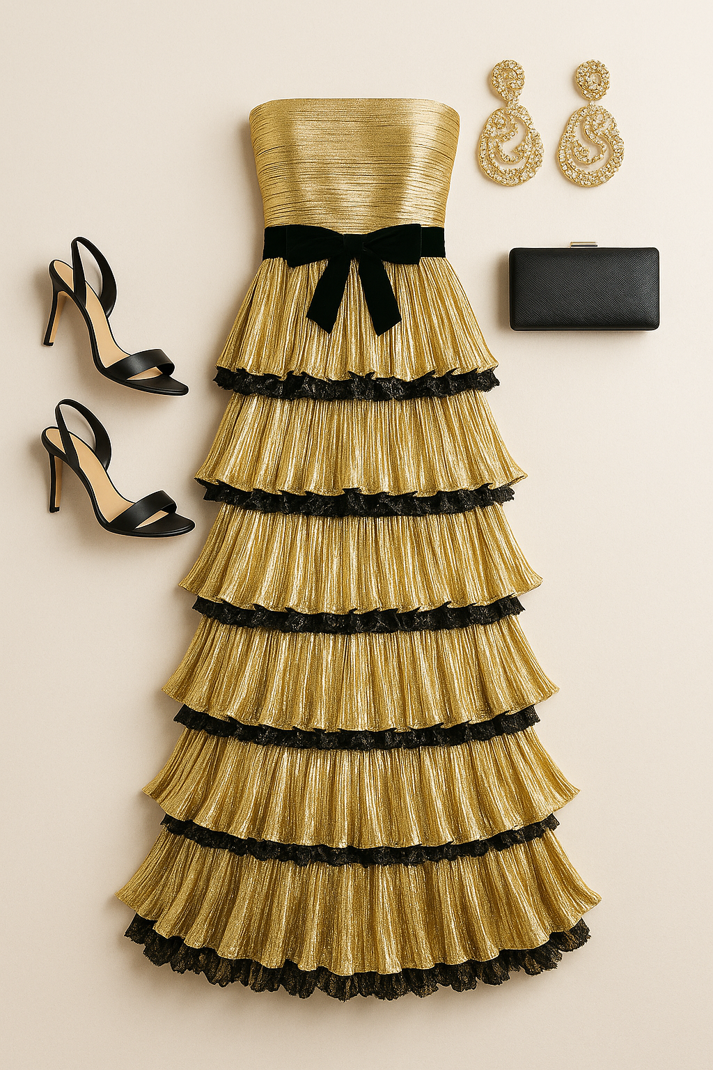 "Flat lay of an elegant evening ensemble inspired by a tiered metallic gold ruffle gown with black velvet bow accents. Include a pleated gold fabric swatch, a miniature black velvet ribbon, a pair of statement gold chandelier earrings, a delicate gold bracelet, a simple gold ring, black strappy evening heels, a black satin clutch with subtle shine, and a soft neutral background in warm cream. Arrange everything neatly in a balanced, editorial layout with soft shadows, luxury styling, and high-end fashion magazine aesthetics."