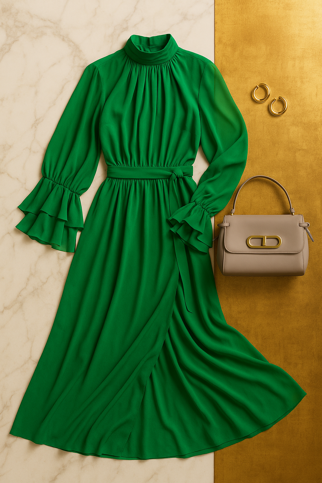 "Create a luxury flat lay composition featuring a vibrant emerald green long sleeve silk gown with layered ruffle cuffs, a high gathered neckline, and a flowing skirt styled elegantly across the frame. Place a structured taupe leather designer handbag with gold hardware beside the dress. Include gold hoop earrings positioned neatly near the top corner. The background should be a blend of polished marble and brushed gold metallic paneling to evoke a sophisticated, high fashion editorial mood. Lighting should be soft and warm to highlight the texture and movement of the fabric."