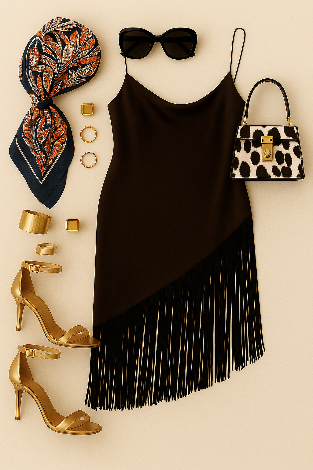“Flat lay on beige background. Brown satin slip dress with black fringe hem, thin straps, and smooth neckline. Silk scarf in orange, navy, and cream bold pattern. Oversized black sunglasses above. Cow print handbag with gold hardware on the right. Gold ankle-strap stiletto heels. Minimal gold jewelry: 3 rings, 2 bangles. Luxury vibe, soft balanced lighting, clean layout”