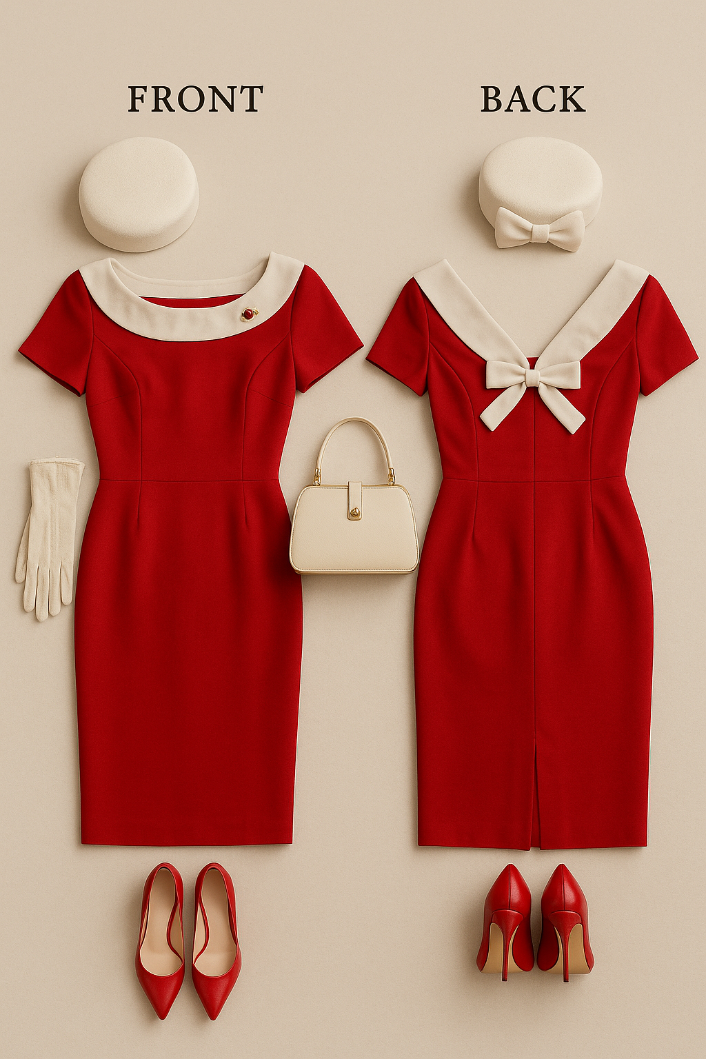 “A vintage-inspired flat lay of a fitted red midi sheath dress with short sleeves, a wide ivory boat neckline, and a dramatic V-back featuring an ivory bow. Accessories include ivory gloves, a structured ivory handbag with a gold clasp, and a cream pillbox hat with a delicate bow at the back. A pair of classic red pointed-toe high heels is neatly positioned below the dress. The image is gridded, showing both front and back views, labeled "FRONT" and "BACK." The background is a soft beige, and the entire layout maintains a clean, editorial, and sophisticated vintage aesthetic with balanced composition and harmonious red and ivory color tones.”