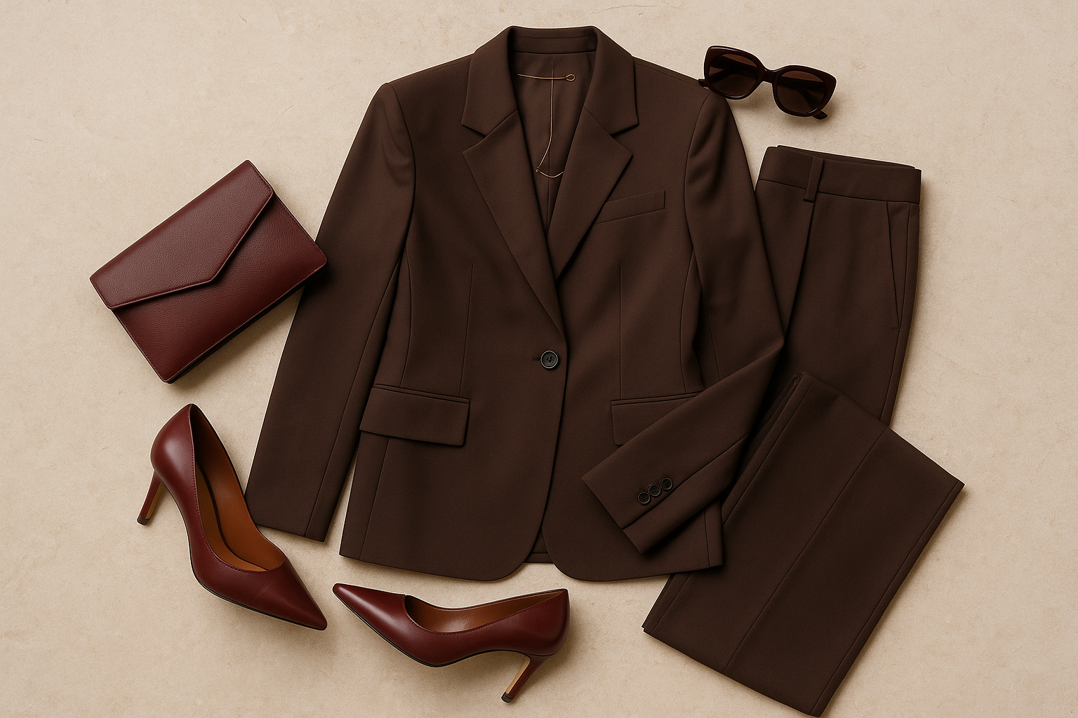 “A minimalist flat lay on a neutral stone background featuring a chocolate-brown tailored blazer and matching wide-leg trousers neatly folded. Add a structured burgundy clutch placed diagonally for contrast, and a pair of pointed burgundy heels positioned slightly below. Include oversized dark sunglasses near the blazer’s neckline area and a delicate gold necklace for a subtle accent. The layout should feel clean, sophisticated, and perfectly balanced to reflect autumn elegance.”