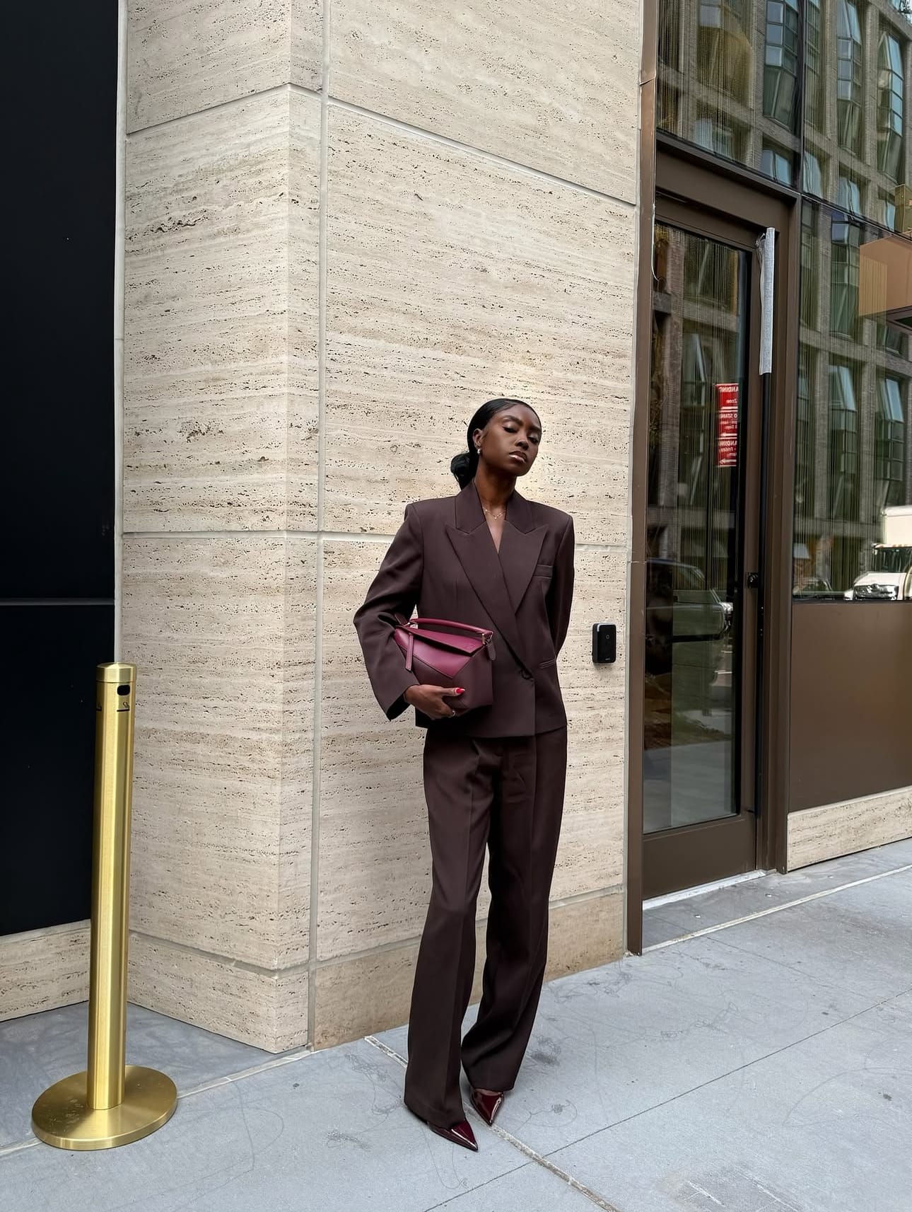 This look finds its rhythm in settings that thrive on understated strength and quiet elegance. The tailored suit adapts seamlessly, offering sophistication without effort and presence without noise. Each space becomes an extension of her style, allowing the richness of tone and structure to speak naturally. It is a reminder that true confidence lies in versatility, and when executed with precision, simplicity becomes unforgettable.