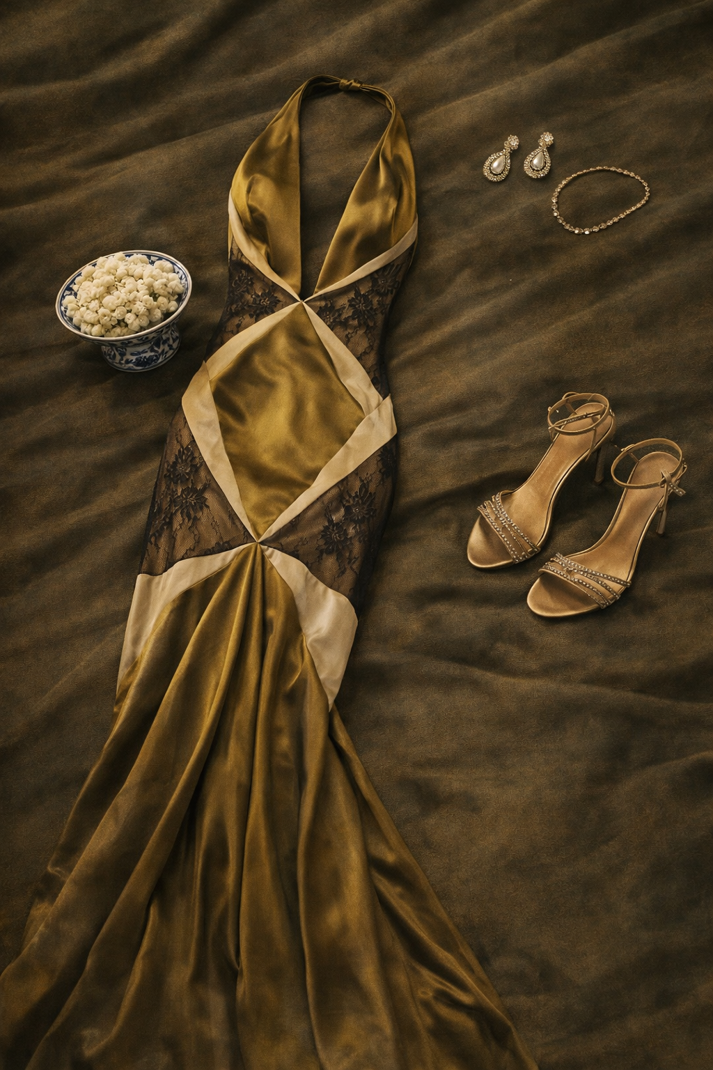 "Create a luxury fashion flatlay centered on a deep olive green and muted gold satin gown with a plunging halter neckline, structured bodice, and sheer black lace side panels. Lay the dress diagonally on a dark olive or moss toned fabric background with soft natural folds to enhance depth and mood. Style the ensemble with elegant gold strappy heels placed near the hem, delicate crystal or pearl drop earrings and a fine gold bracelet arranged with intentional spacing."