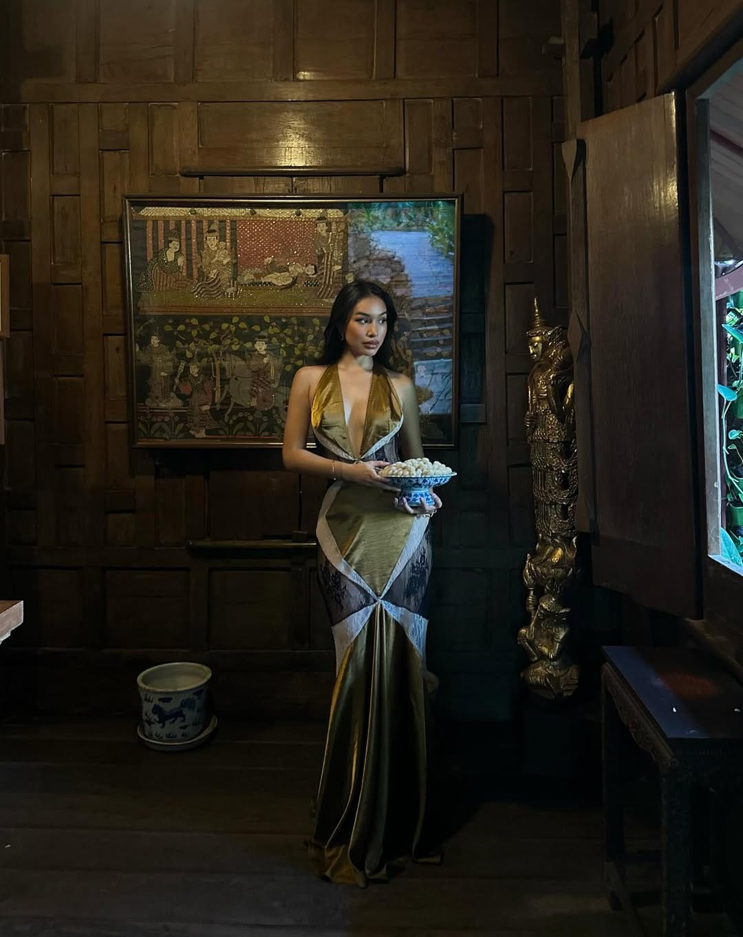 Under low light and carved wooden walls, Suphawini’s look unfolds like a quiet cinematic moment, where elegance is expressed through restraint rather than spectacle. This exploration offers insight into how her outfit harmonizes fabric, form, and atmosphere, revealing how style can feel intimate, intentional, and deeply evocative without ever needing to announce itself.