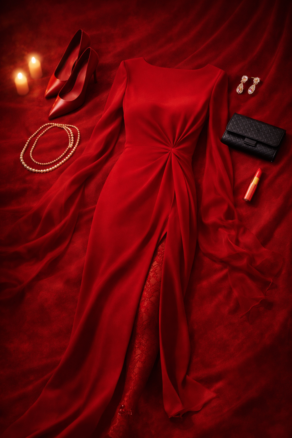 "Create a high-end editorial flat lay of an elegant scarlet evening ensemble inspired by Silvia Braz’s couture look, arranged on a rich tonal red background with soft velvet or matte silk texture that enhances depth without distraction. The composition should feature a long, sculpted red gown with a clean fitted bodice, gently gathered waist detail, and a flowing floor-length skirt with a subtle opening that reveals delicate lace beneath. Style the garment with refined, minimal accessories placed with intentional spacing, including a structured black clutch, slender red heels, and understated gold jewelry that adds quiet luminosity without competing with the dress."